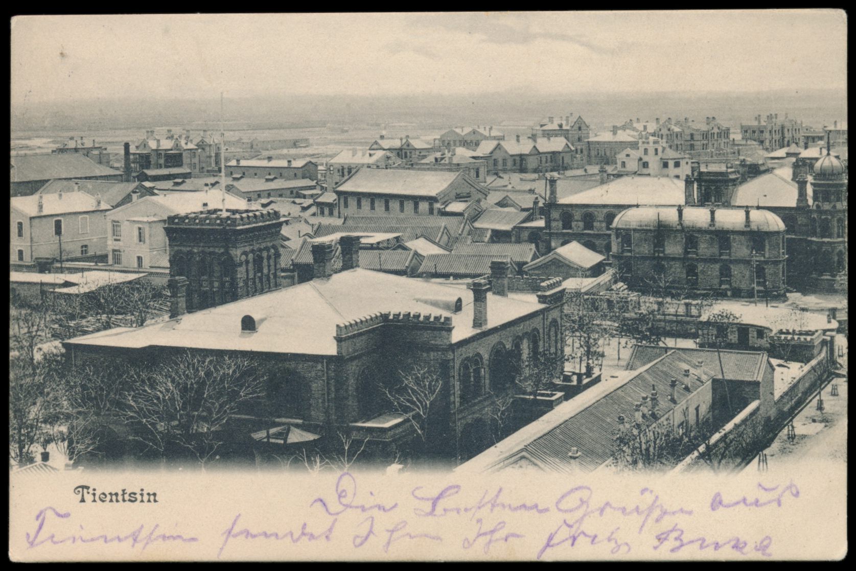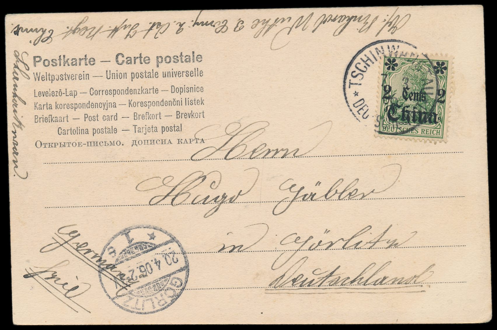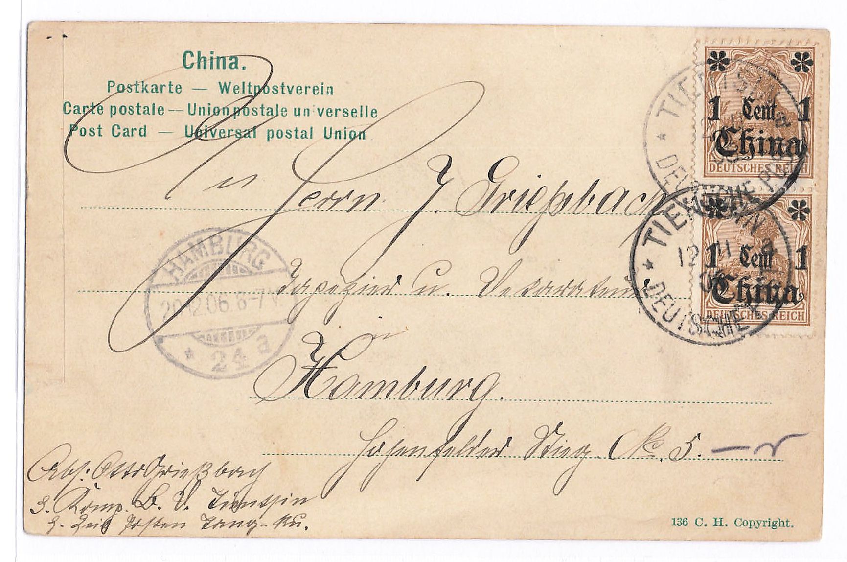 2 x 1 C. auf Ansichtskarte Peking, vorderseitig handschriftliche Absenderangabe "... z. Zeit Posten Tong-ku ", Stempel Tientsin 11.11.06, Soldatentarif nach Deutschland, Ankunftstempel Hamburg 20.12.06, Bedarf