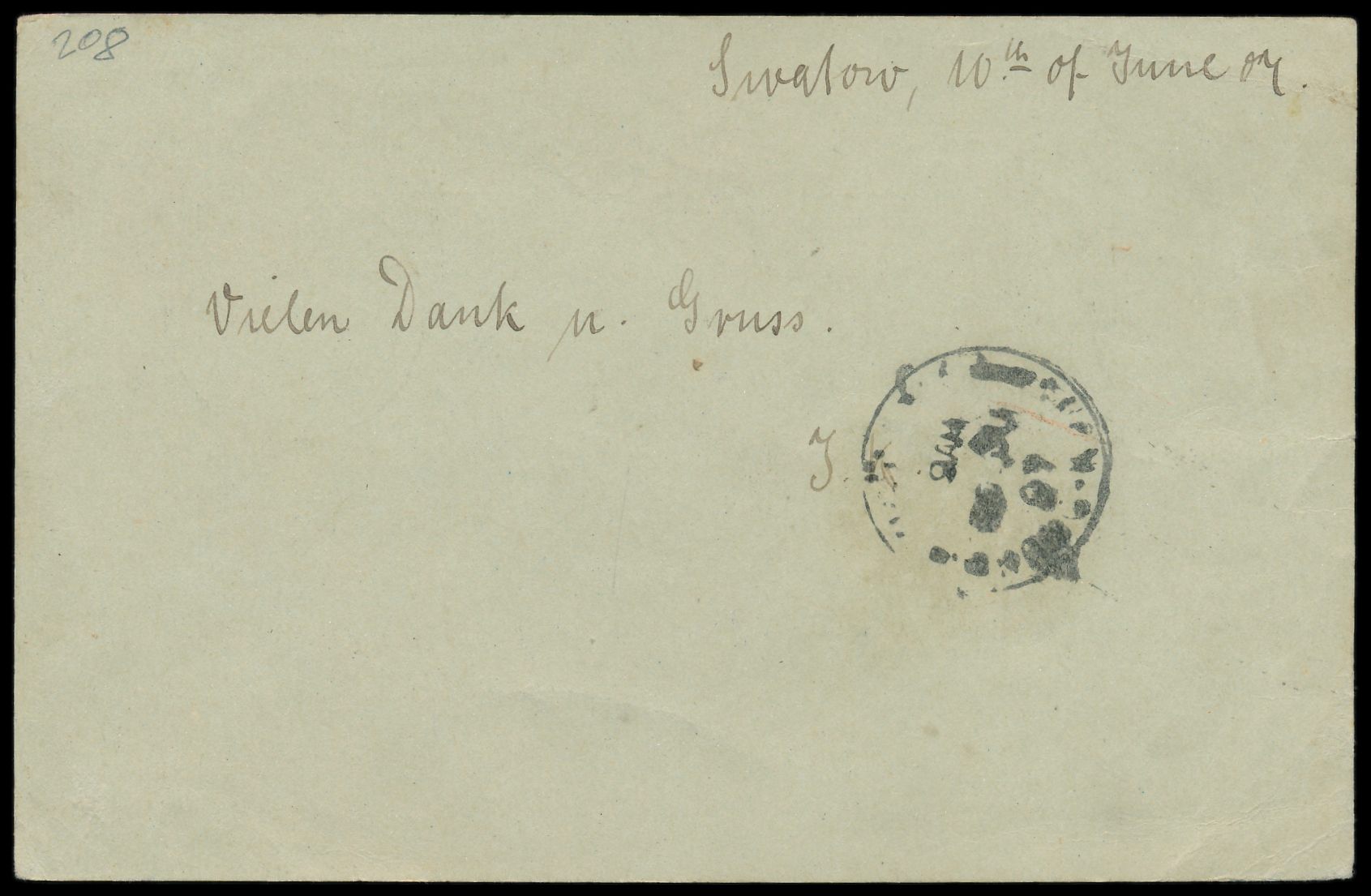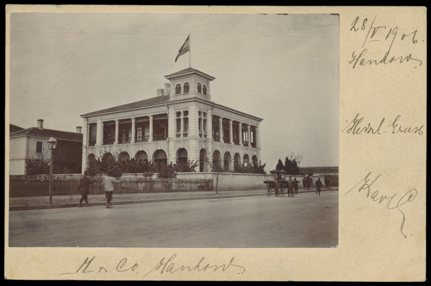 Fotografie des Firmengebäudes von Melchers & Co. in Hankau rückseitig auf bereits ungültiger Ganzsache 10 Pf., deshalb 4 C.-Marke zufrankiert, Stempel Hankau 28.5.06, nach Lübeck, nachgesandt nach Bockwiese bei Goslar, Ankunftstempel 7.7.06