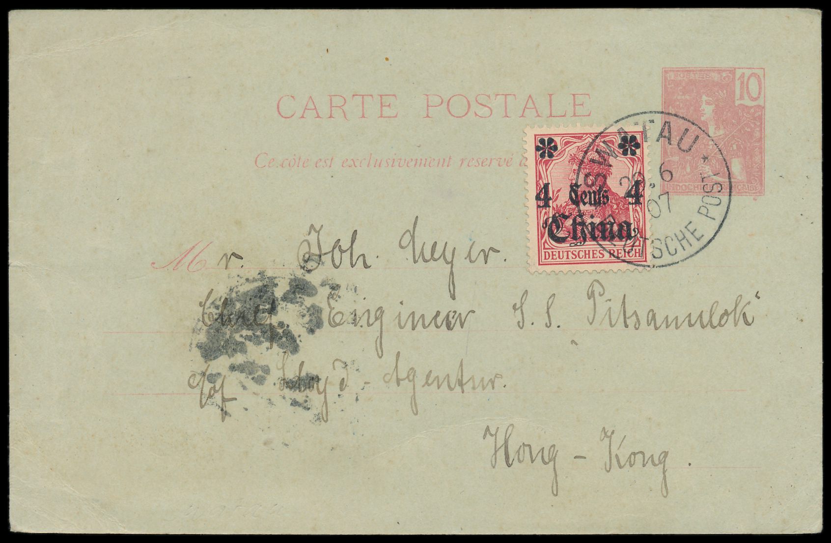 Stempel Swatau 29.6.07 auf Französisch-Indochina-Ganzsache 10 C. mit Zusatzfrankatur Dt. Post 4 C. an den Chef-Ingenieur an Bord Lloyd-Dampfer S.S. Pitsanulok in Honkong, rückseitig Ankunftstempel Victoria 30.6.07, Grußtext
