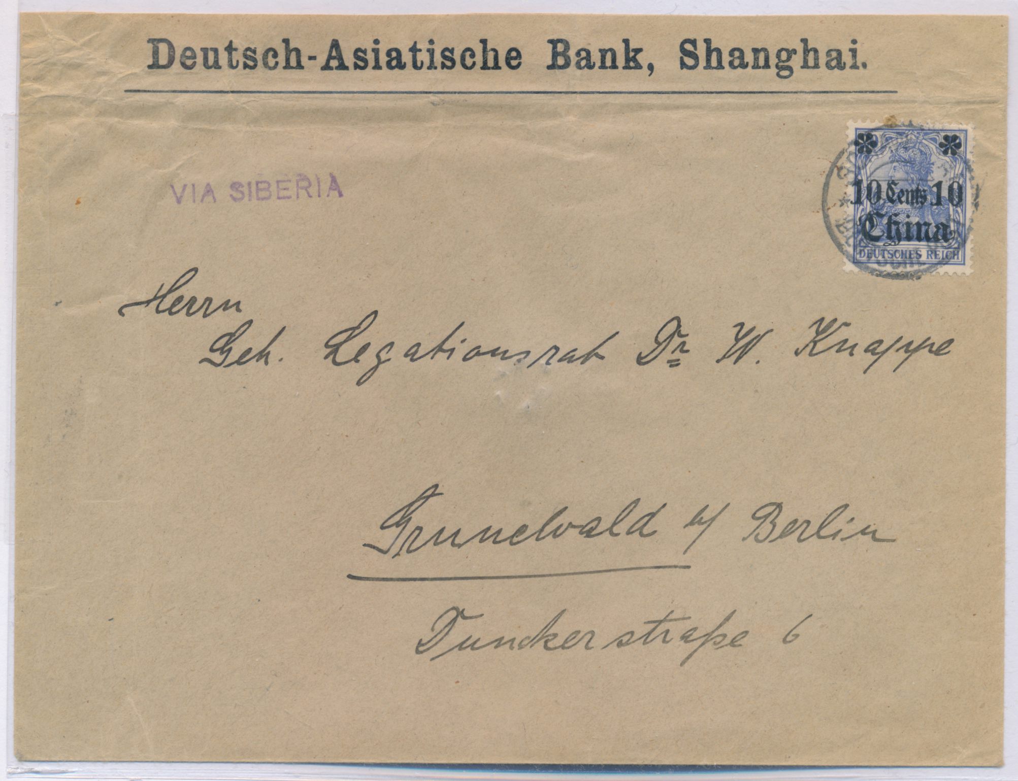 10 C. auf Brief mit vorderseitigem Absendereindruck "Deutsch-Asiatische Bank, Shanghai" nach Deutschland, Stempel Schanghai 6.5.08, Leitstempel "via Siberia", Ankunftstempel Grunewald 25.5.
