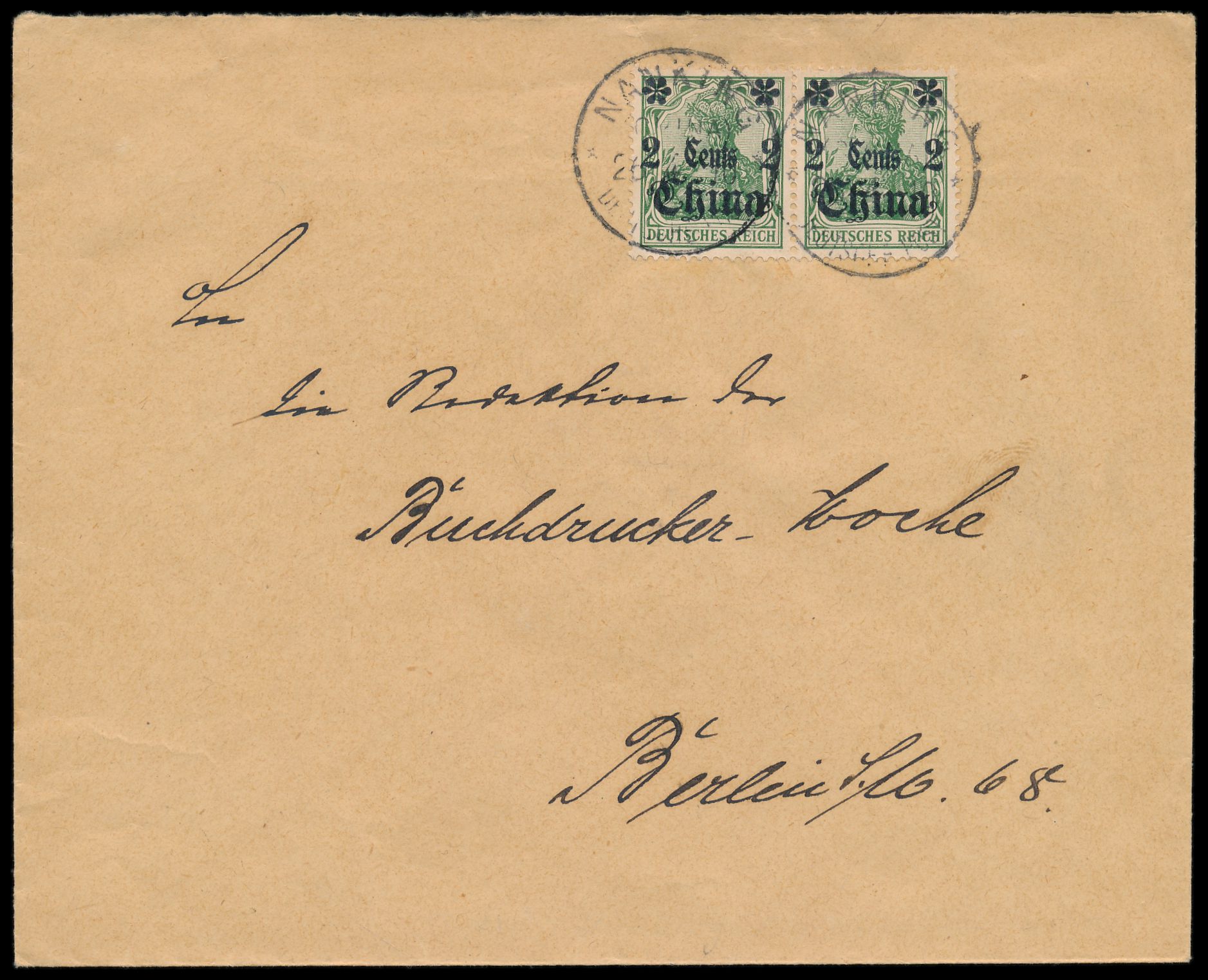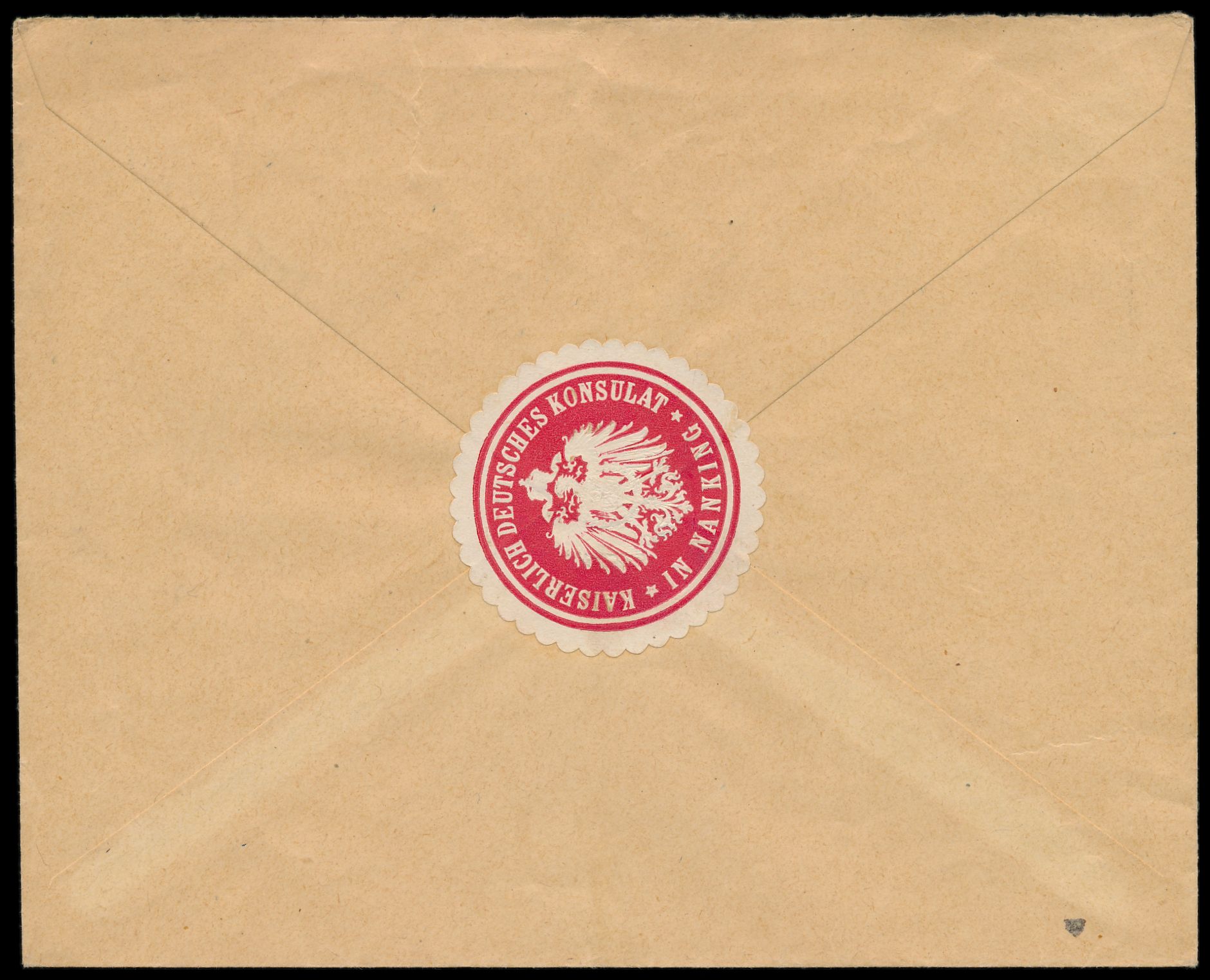 2 x 2 C. auf Brief mit Stempel Nanking 26.4.10 nach Berlin, rückseitig rote Prägedruck-Siegelmarke "Kaiserlich Deutsches Konsulat in Nanking"