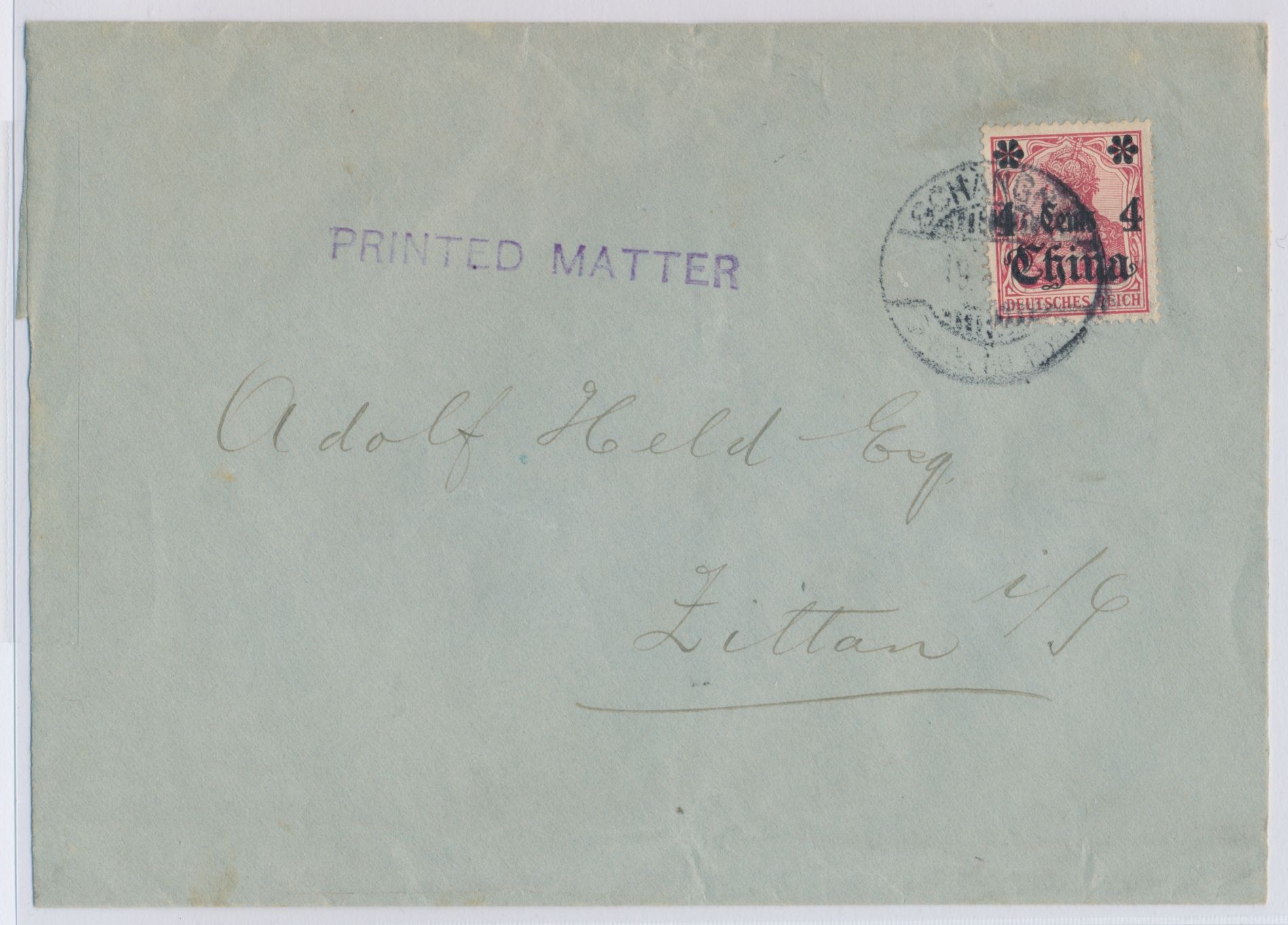 Einzelfrankatur 4 C. auf Streifband der 2. Gewichtsstufe (51 bis 100 g) nach Deutschland, Gitterstempel Schanghai 19.4.11, Bedarf