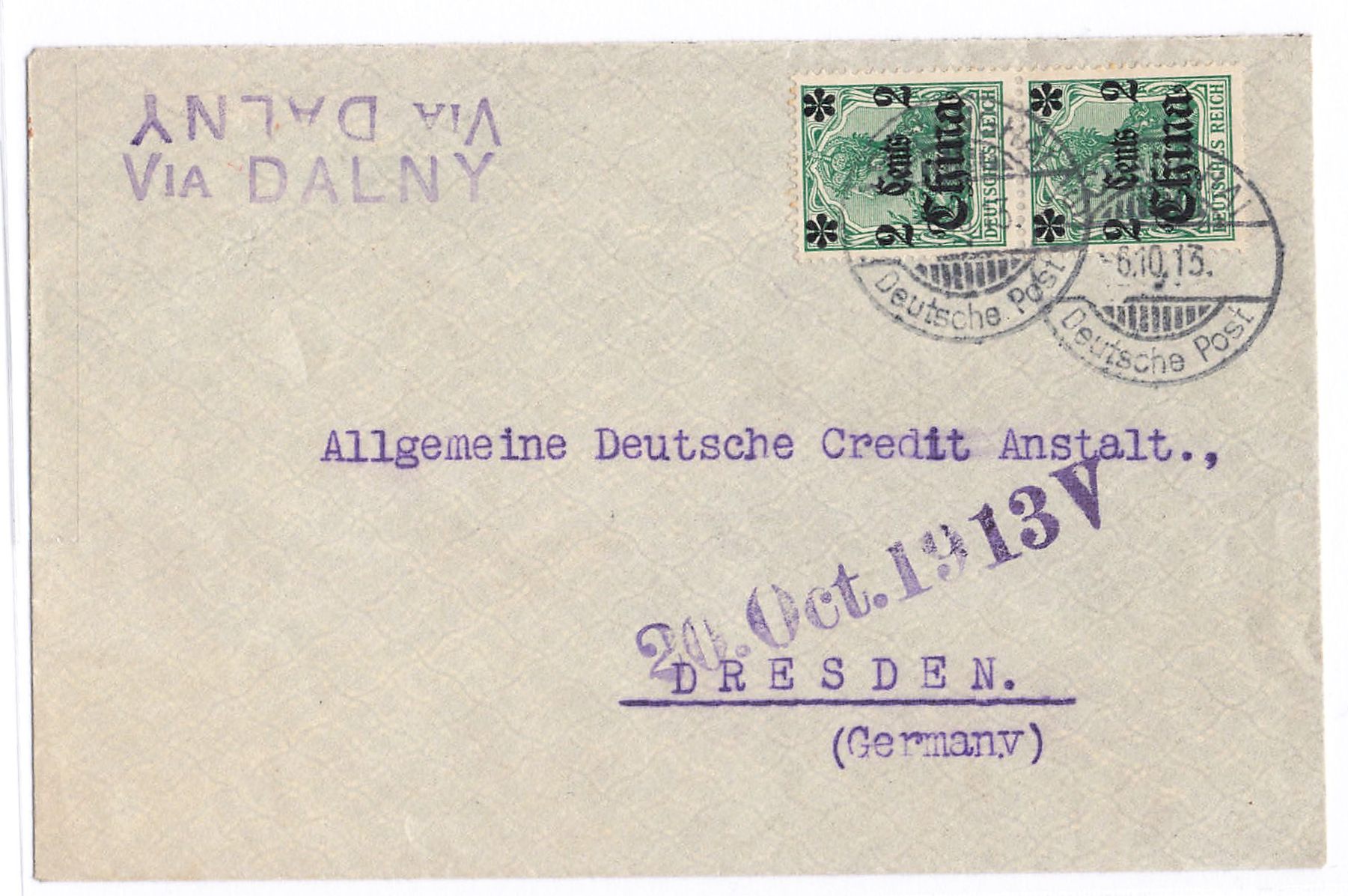 2 x 2 C. auf Brief der "Russo-Asiatic Bank, Shanghai" nach Deutschland, Gitterstempel Schanghai 6.10.13, violetter Leitstempel "Via Dalny", Bedarf