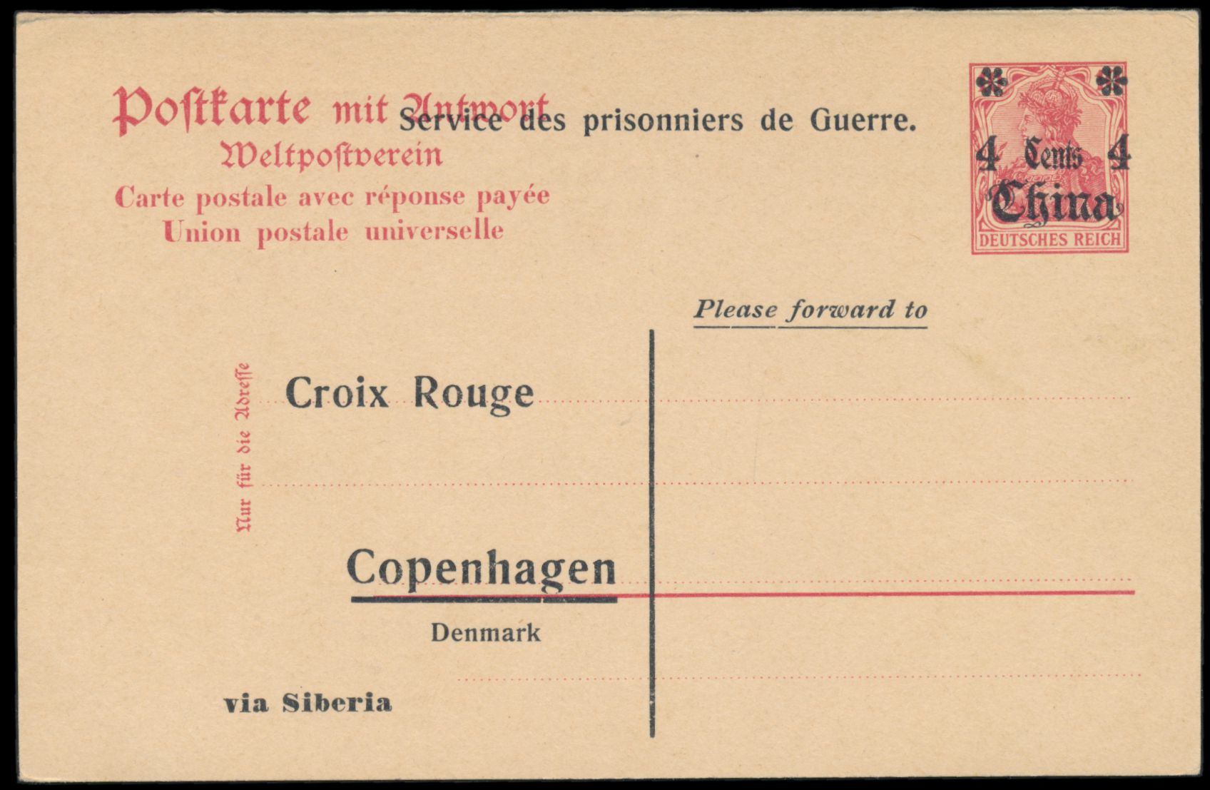 4 C. (links unten Eckfehler) und 10 C. auf Vordruckumschlag "Service des prisonniers de guerre." der "Hülfsaktion für Deutsche u. Österr.-Ungar. Gefangene in Sibirien" nach Deutschland, Stempel Tientsin b 15.6.15, noch Inlandstarif, R-Zettel Einfeldt Nr. 16, Ankunftstempel Grünsfeld 15.8.15