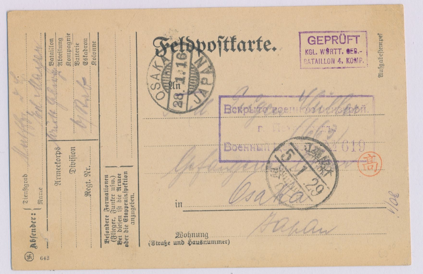 Osaka, Feldpostkarte aus Deutschland an einen Kriegsgefangenen im Lager Osaka, Zensurstempel "Geprüft / Kgl. Württ. Geb. Bataillon 4. Komp." und russischer Zensurstempel von Petrograd, Ankunftstempel Osaka / Japan 28.1.16 und Osaka-Horie 29.1.1916, orangener Han Yoshikawa (?)