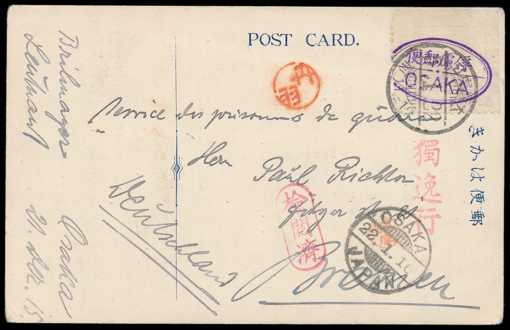 Osaka, Vordruckkarte (rückseitig ohne Bild) mit gezähntem Klebezettel mit ovalem Lagersiegel in violett (Seitz Type II), Einzelstempel Kenetsuzumi (Type II) und Leitstempel Doitsu in rot, orangener Han Niwa und Kakihara, Poststempel Osaka-Horie 22.1.1916 und Osaka / Japan 22.1.16, nach Bremen, Absender ist Leutnant Brilmayer, Text rückseitig mit Schreibmaschine geschrieben (zur Erleichterung der Zensur?), nur wenige Belege mit Lagermarke bekannt