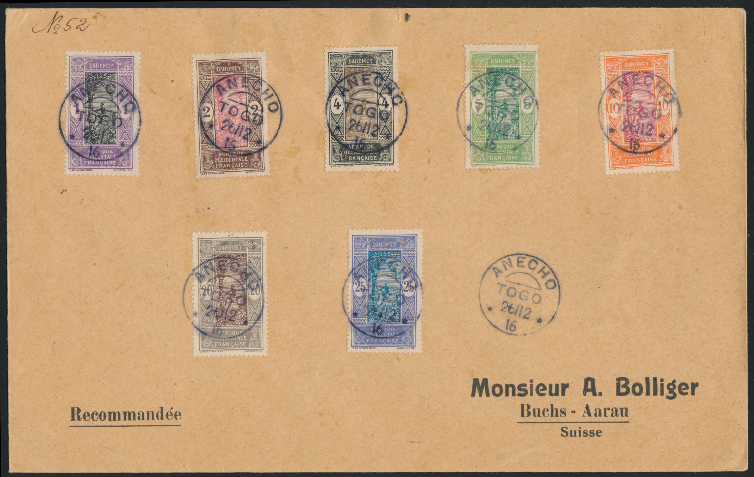 Französische Besetzung, 5 Werte 1 Ct. bis 25 Ct. von Dahomey auf großformatigem Einschreibbrief in die Schweiz, deutscher Stempel Anecho Togo 26.12.16, Transitstempel Lome 27.12.16 und Registered London 13.2.17, Ankunftsstempel Buchs 18.2., dekorativ