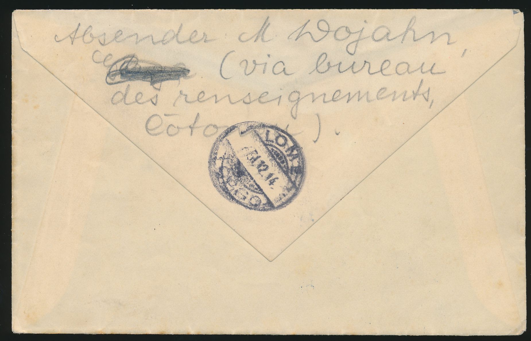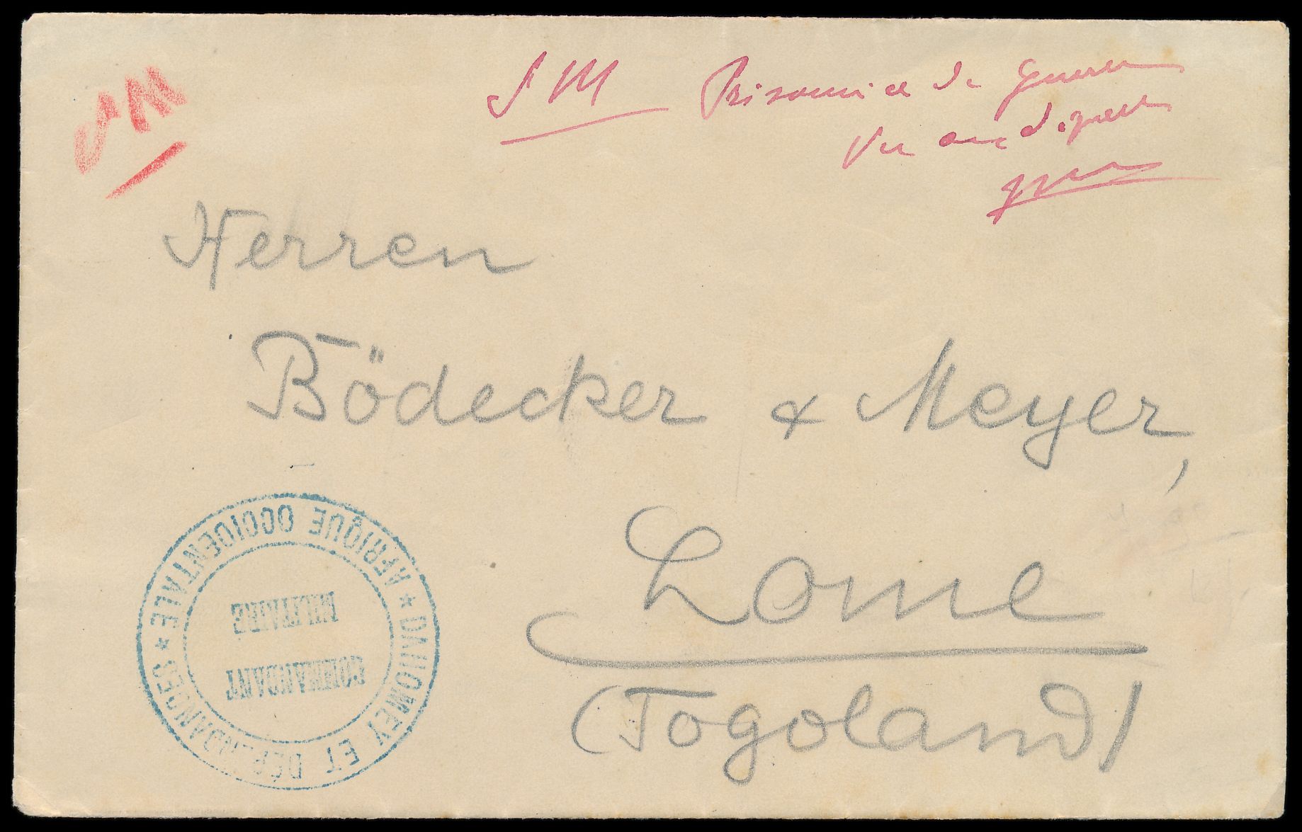 Brief aus dem Kriegsgefangenenlager Gaya am Niger nach Lome, handschriftlicher Lager-Zensurvermerk in rot, blaues Dienstsiegel Dahomey et Dépendances / Afrique Occidentale / Commandant Militaire, Ankunftstempel Lome 31.12.14. Absender ist M. Wojahn aus Togo
