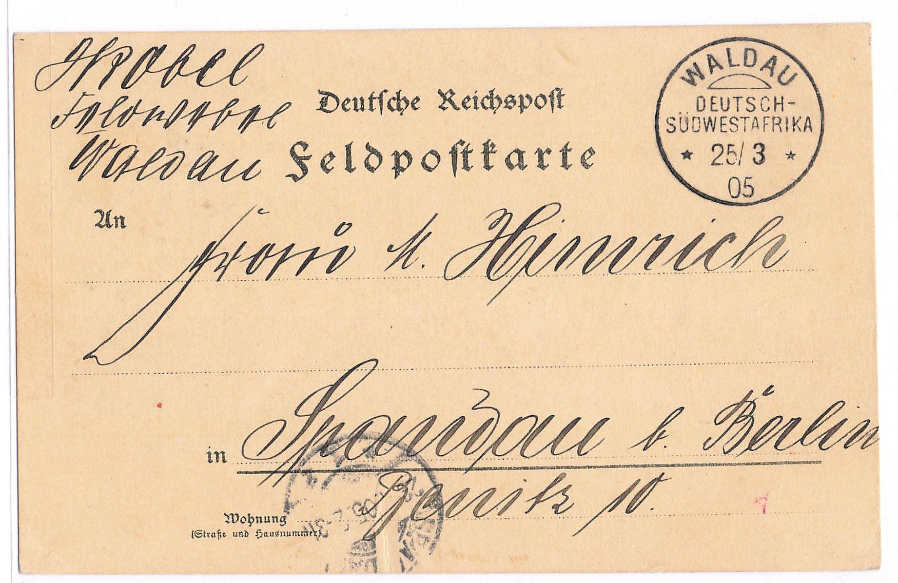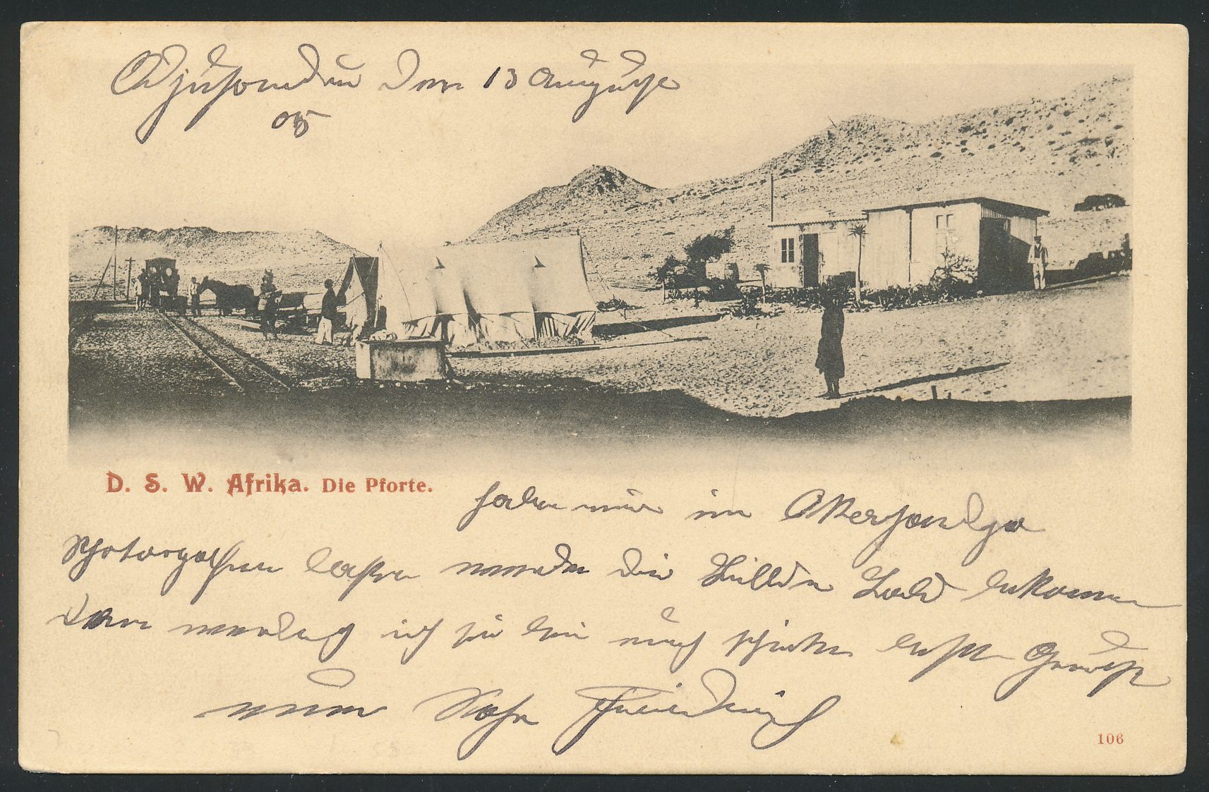 Stempel K. D. Feldpoststation Nr. 1 14.8. auf Ansichtskarte "Die Pforte", geschrieben in Otjosondu, nach Hettstedt, Ankunftstempel 14.9.05, Bedarf