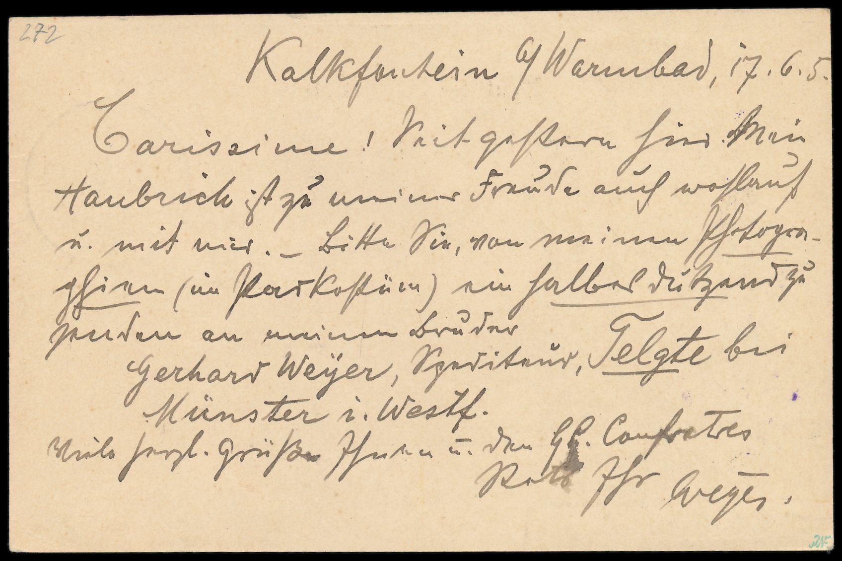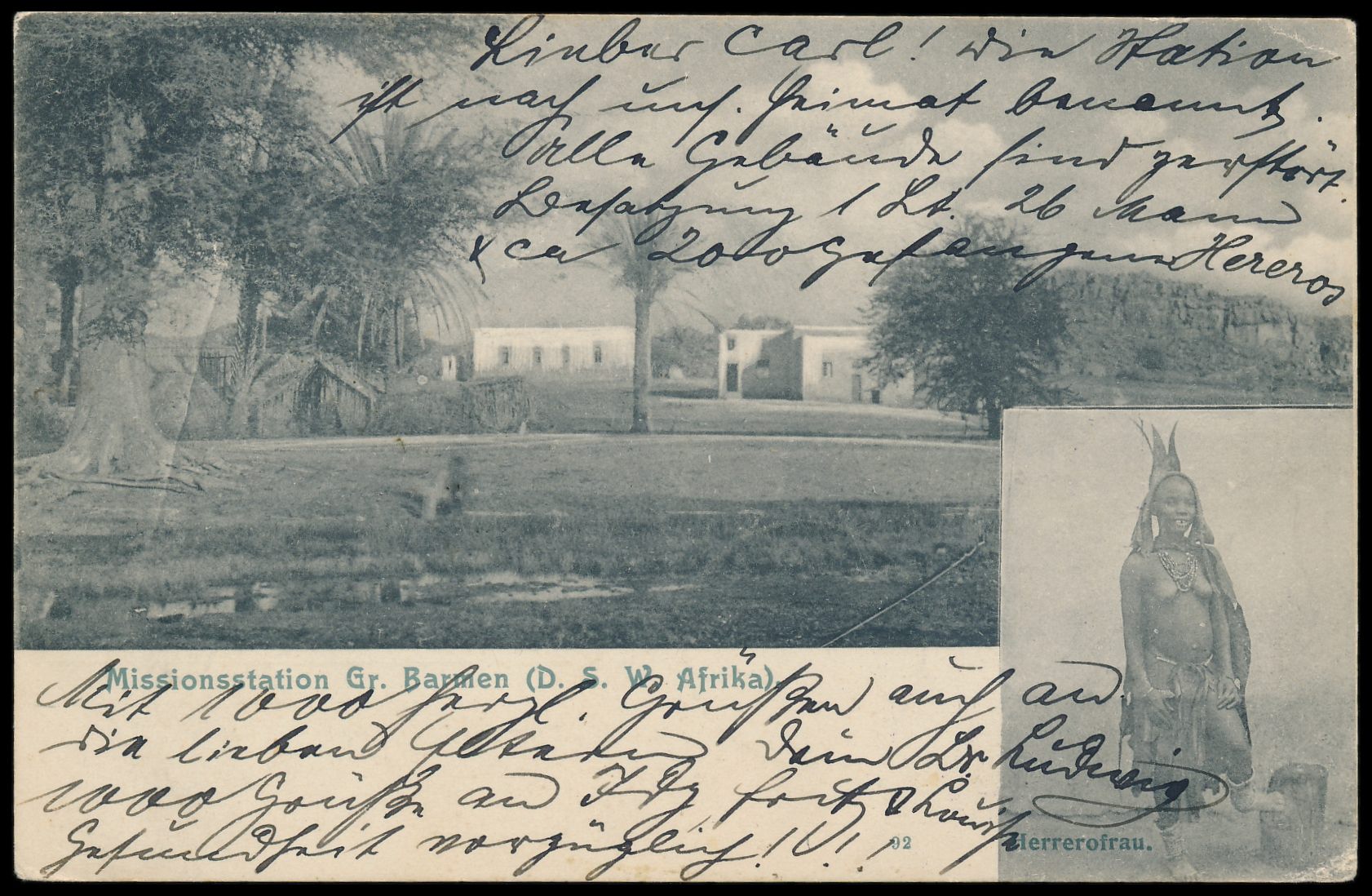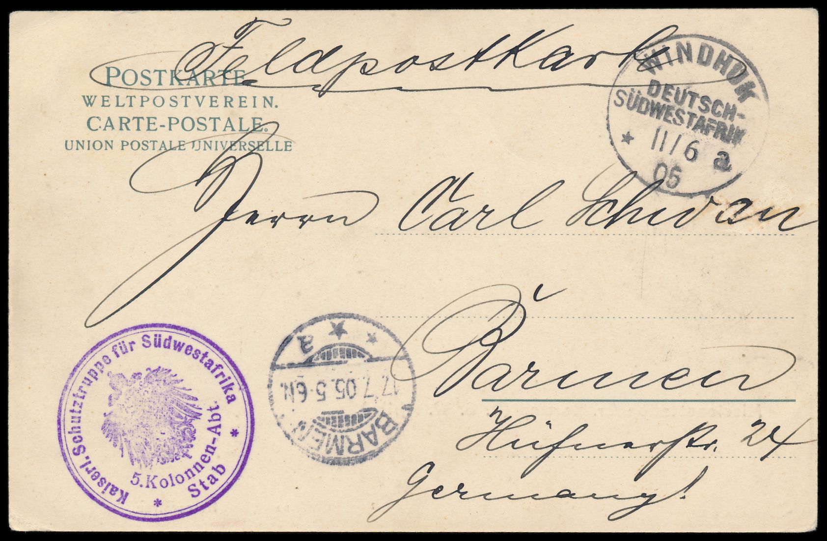 Stempel Windhuk a 11.6.05 und violettes Dienstsiegel 5. Kolonnen-Abt. / Stab (Adlerstempel) auf Ansichtskarte Missionsstation Gr. Barmen, nach Barmen, Ankunftstempel 17.7.05, Bedarf, Text "... Die Station ist nach uns. Heimat benannt. Alle Gebäude sind zerstört. Besatzung 1 Lt., 26 Mann & ca. 200 gefangene Hereros ..."