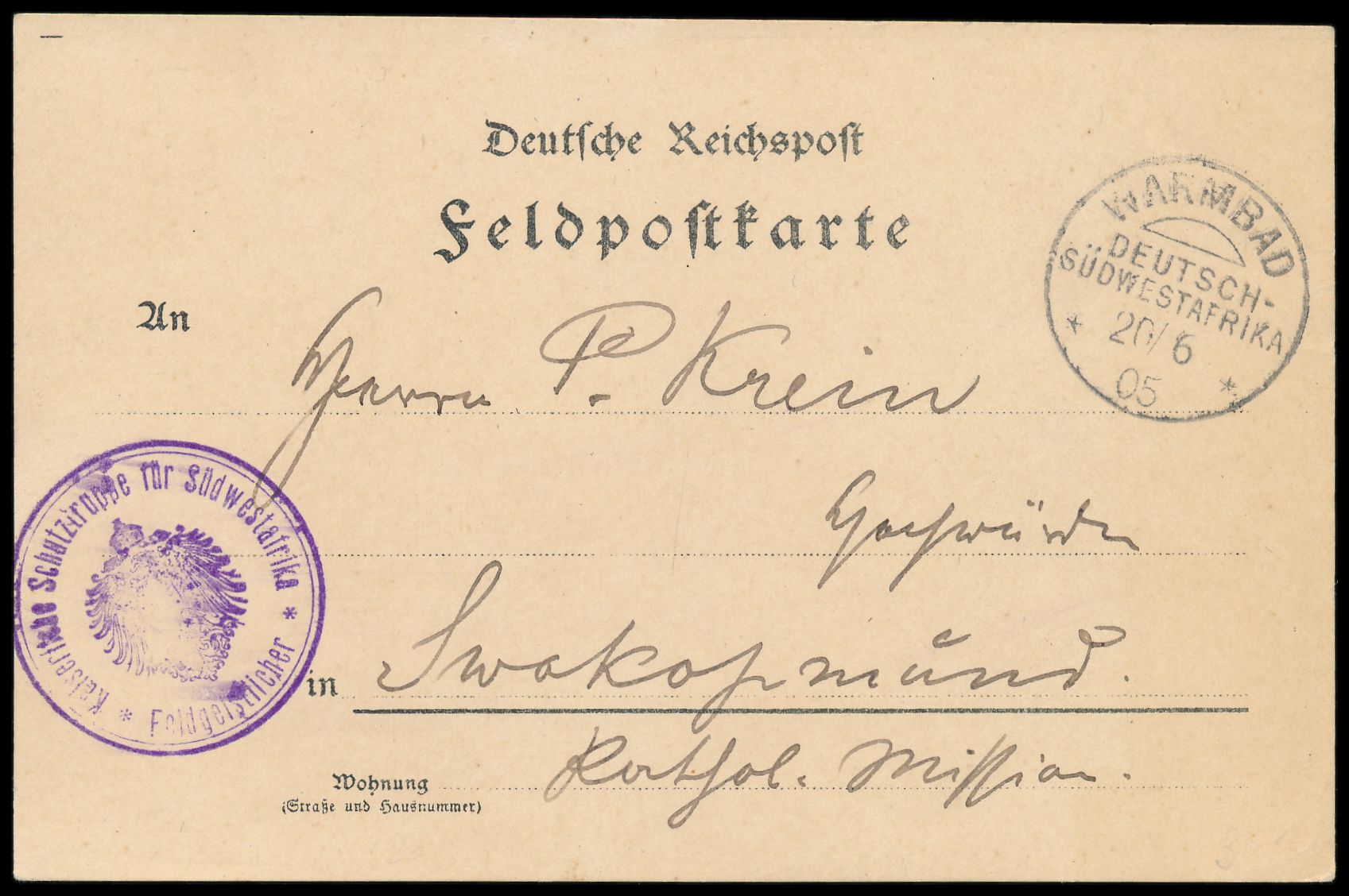 Stempel Warmbad 20.6.05 und seltenes Dienstsiegel Feldgeistlicher (Adlerstempel) auf Feldpost-Vordruckkarte nach Swakopmund, Bedarf