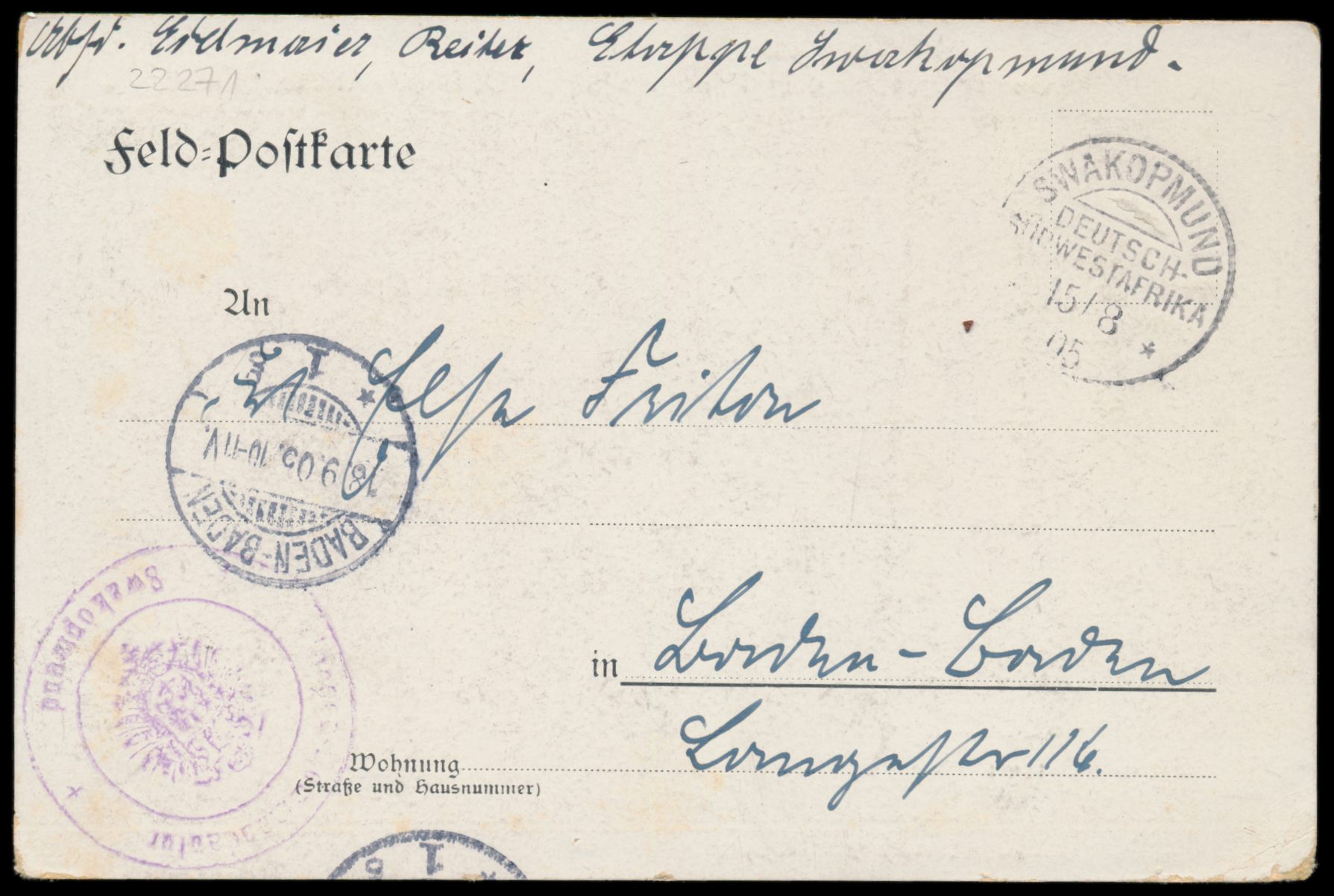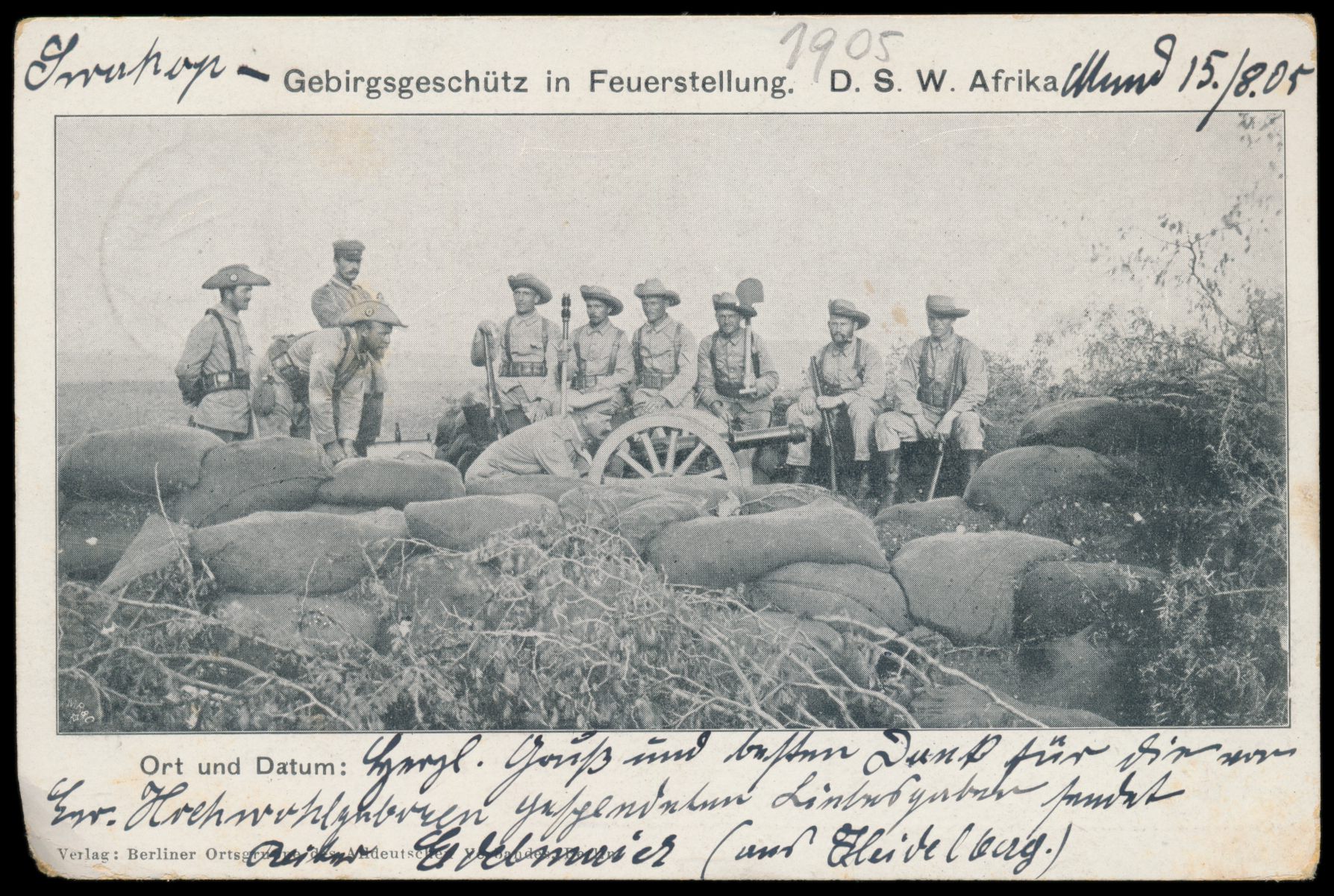 Liebesgaben-Feldpostkarte mit rückseitigem Bild "Gebirgsgeschütz in Feuerstellung ...", Verlag Berliner Ortsgruppe des Alldeutschen Verbandes, Vogenbeck LFPK 9, 9.1, Stempel Swakopmund 15.8.05 und seltenes provisorischem Dienstsiegel Etappen-Kommandantur Swakopmund , nach Baden-Baden, Ankunftstempel 18.9.05, Bedarf