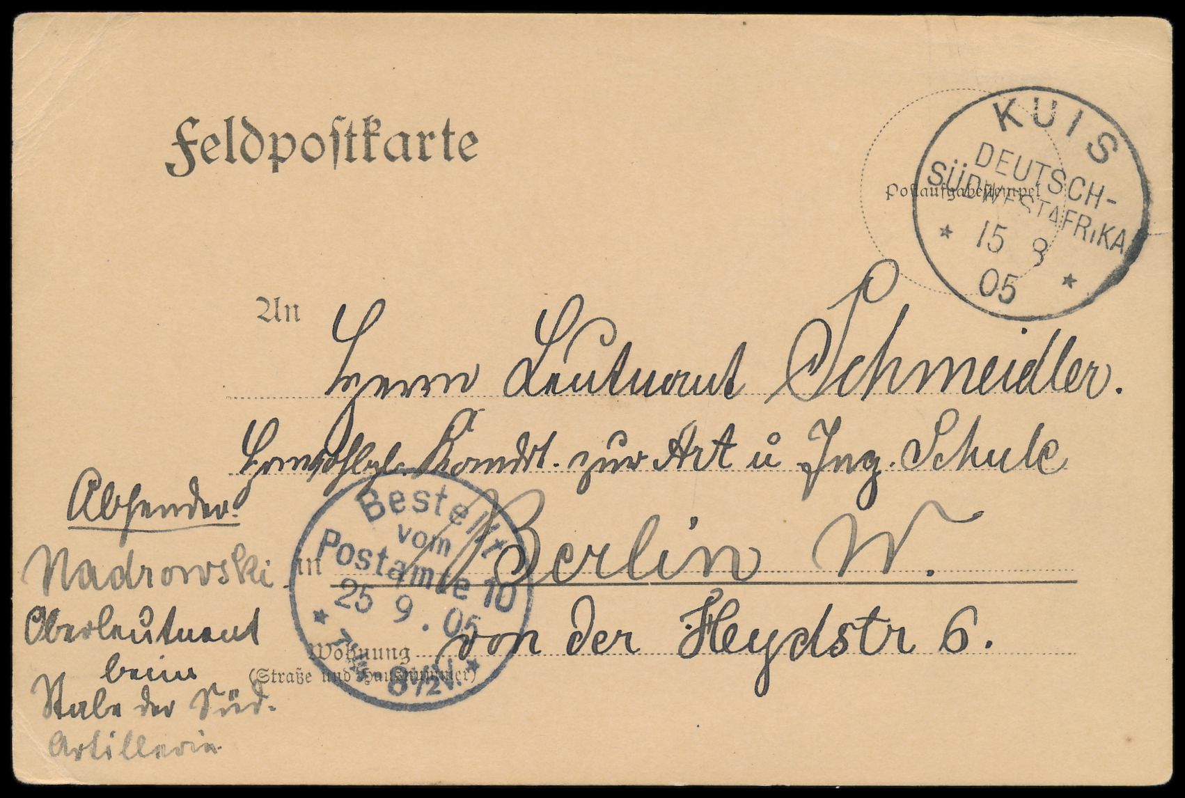 Stempel Kuis 15.8.05, verwendet in Kub, auf Feldpost-Vordruckkarte (Vogenbeck FPK 19) nach Berlin, geschrieben in Persip d. 29.7.05, vorderseitig handschriftlicher Absendervermerk "Madrowski, Oberleutnant beim Stabe der Süd-Artillerie", Ankunftstempel 25.9.05