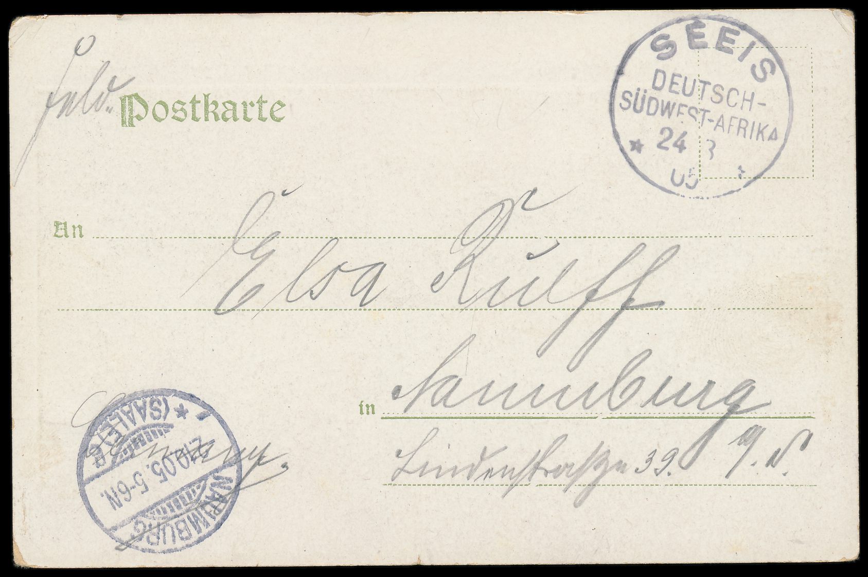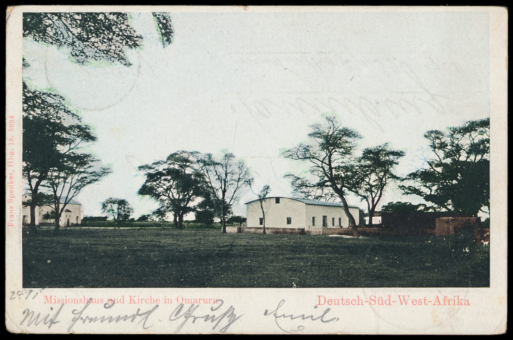 Stempel Seeis 24.8.05 auf farbiger Ansichtskarte "Missionshaus und Kirche in Omaruru", Verlag Franz Spenker, Hbg., Feldpost nach Naumburg (Saale), Ankunftstempel 2.10.05, Grußtext