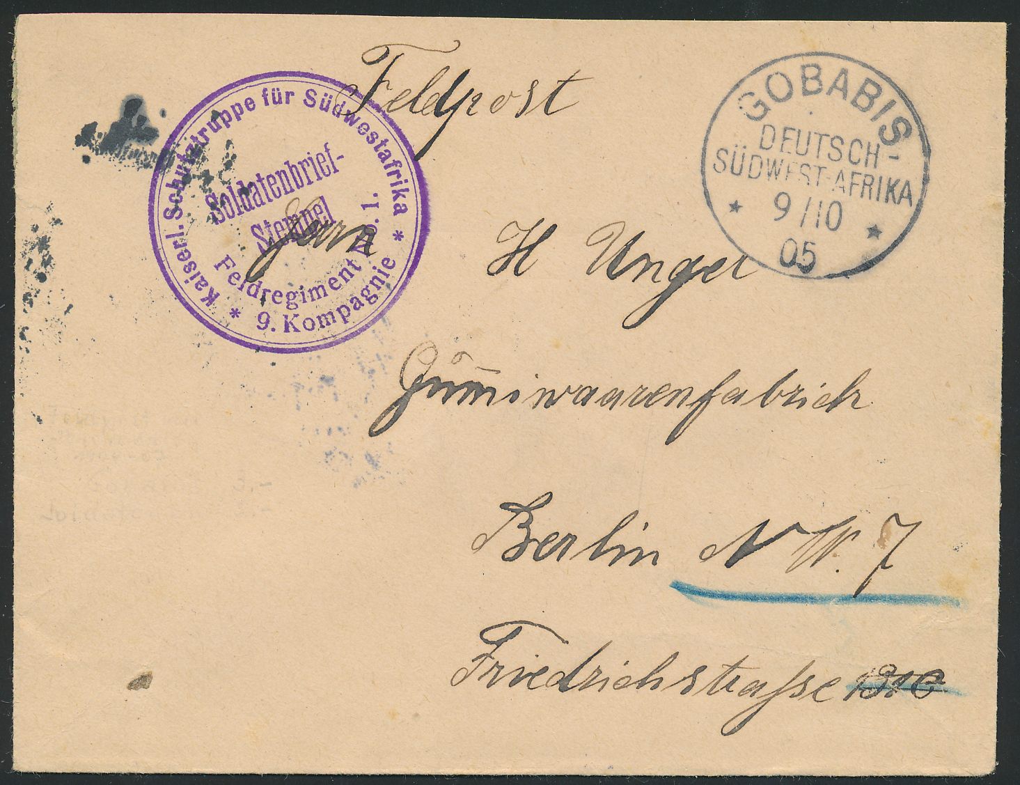Feldpostbrief mit Stempel Gobabis 9.10.05 und Briefstempel Feldregiment No. 1 / 9. Kompagnie nach Berlin, rückseitig Absender mit Ortsangabe Station Oas, Ankunftstempel 13.11.05, Bedarf