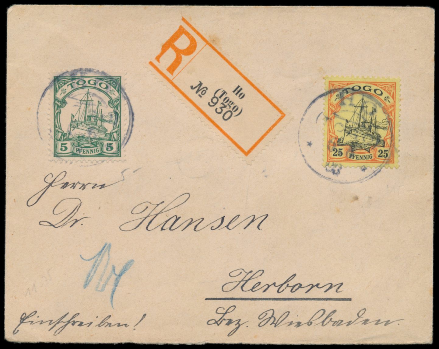 Stempel Ho 6.6.08 auf portorichtigem Einschreibbrief mit 5 Pf. und 25 Pf. nach Herborn, Ankunftstempel 30.6.08