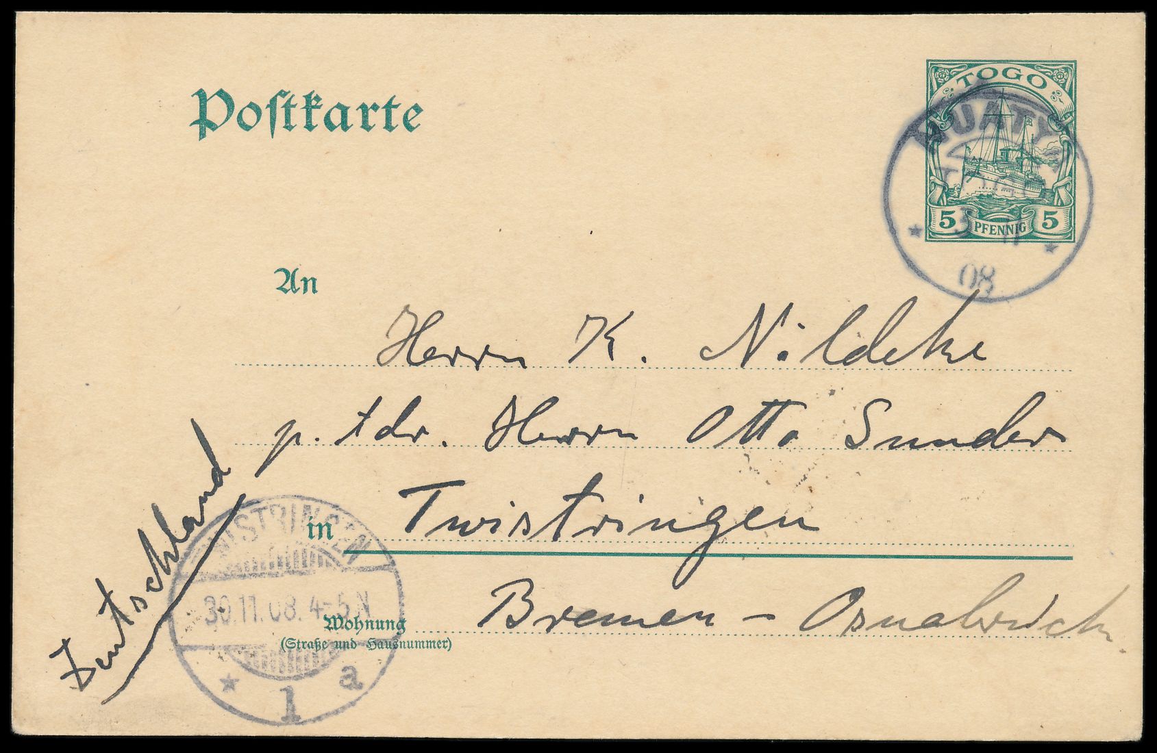 Stempel Nuatyä 3.11.08 auf Ganzsache 5 Pf. nach Deutschland, Ankunftstempel Twistringen 30.11.08, Bedarf