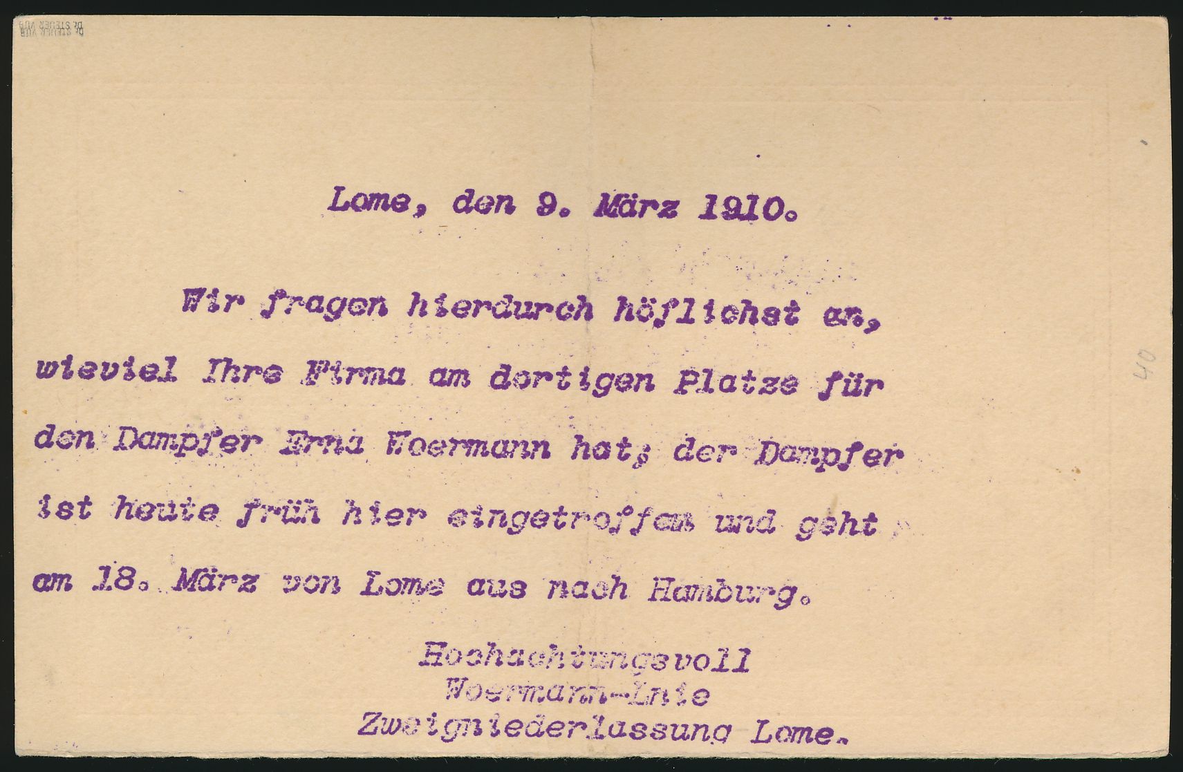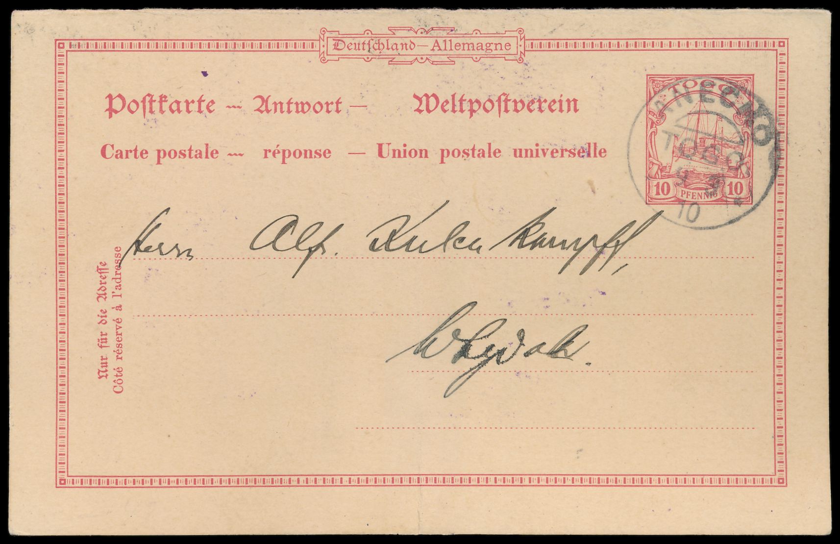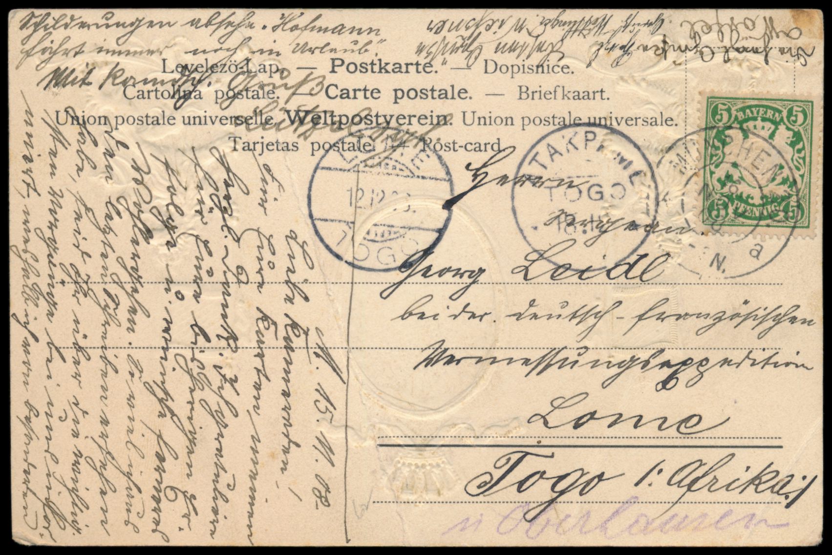 Bayern 5 Pf. auf Postkarte mit Stempel München 16.11.08 an Feldwebel Georg Leidl "die der deutsch-französischen Vermessungsexpedition in Lome / Togo" (September 1908 bis Ende 1909 unter Leitung Hauptmann Freiherr v. Seefried), Ankunftstempel Lome 12.12.08, in das nördliche Grenzgebiet nachgesandt, Durchgangstempel Atakpame 18.12.06, senkrechter Mittelbug, langer Bedarfstext