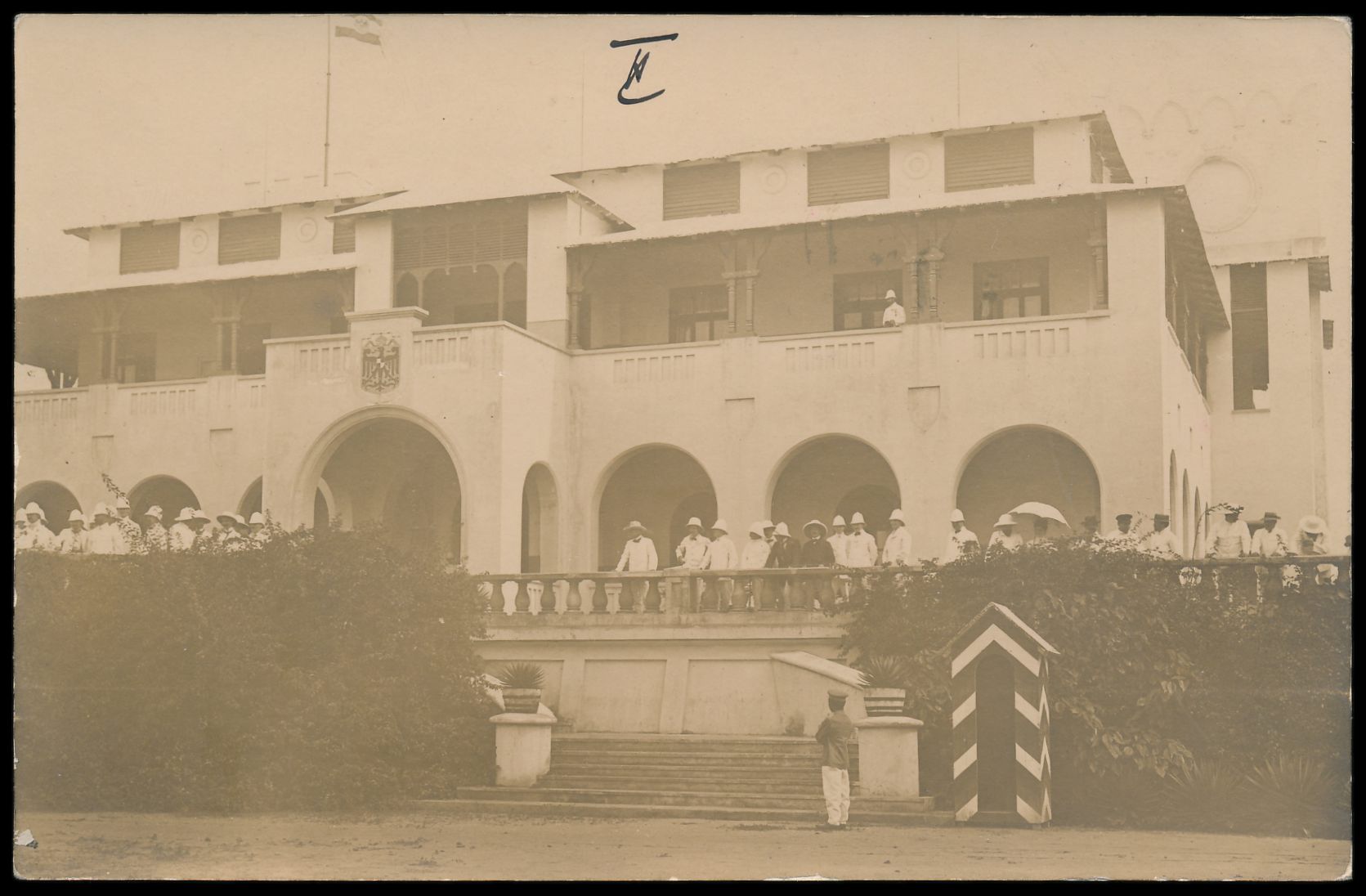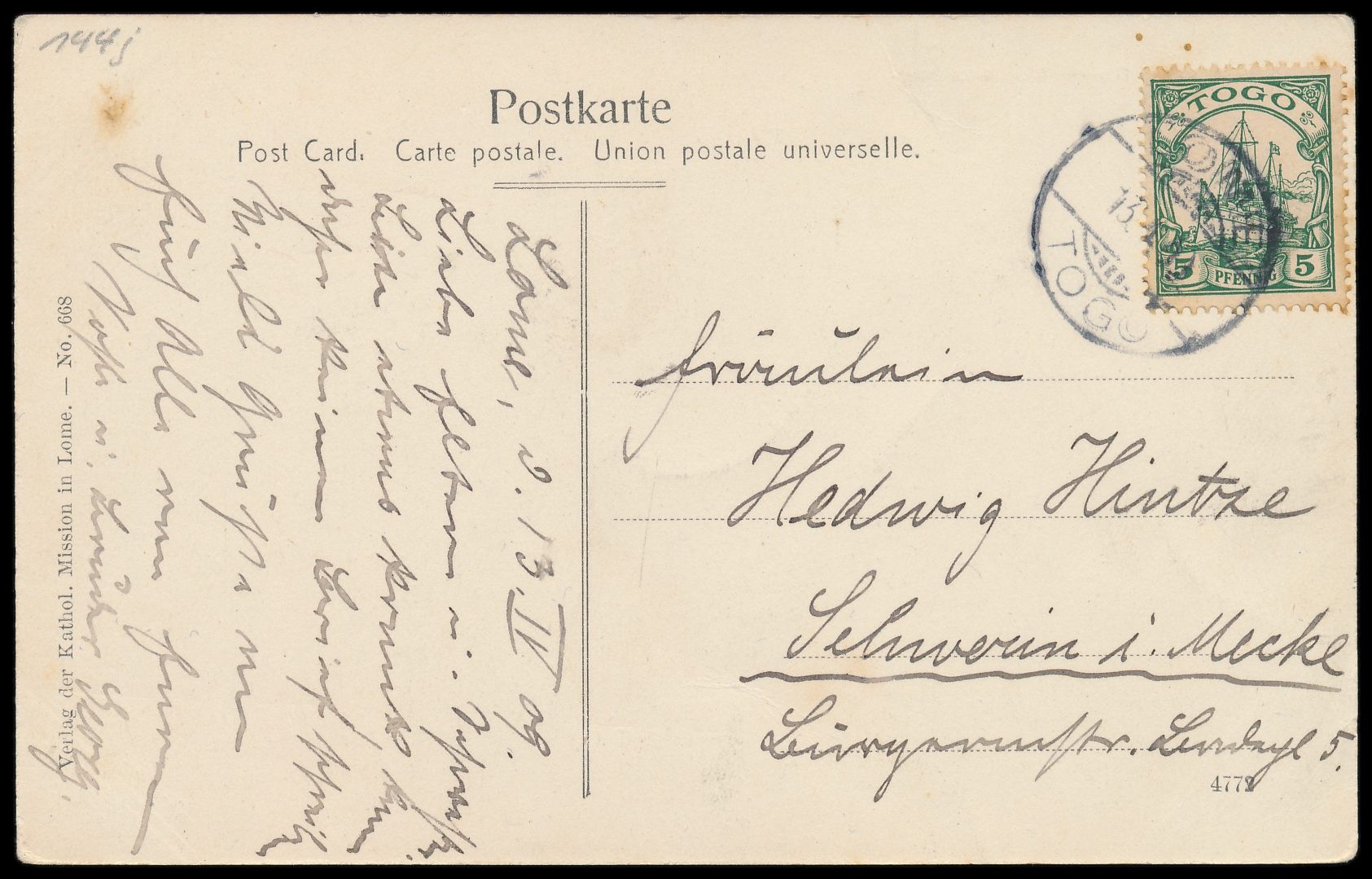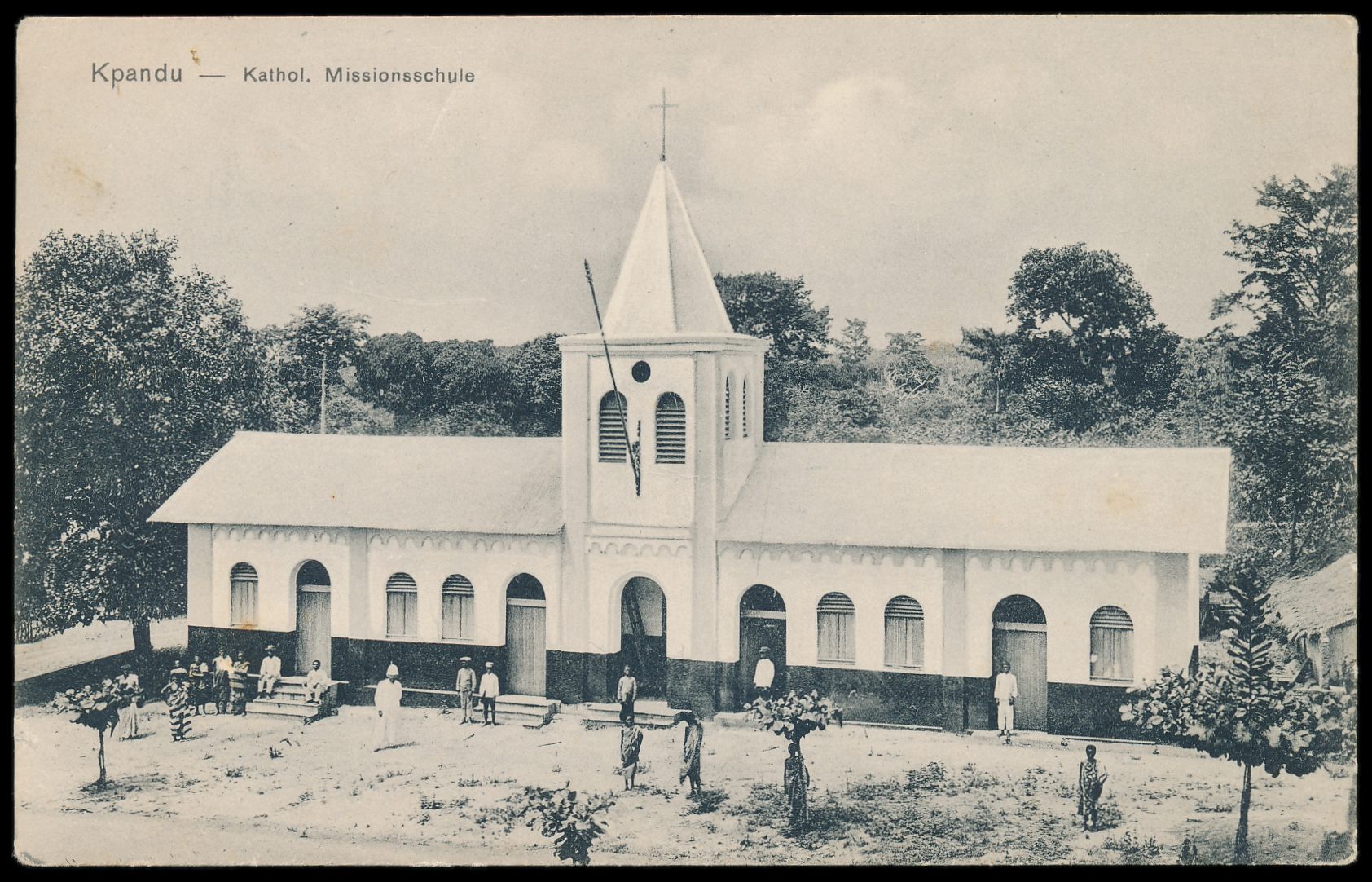Ansichtskarte Kpandu - Kathol. Missionsschule, Verlag der Kathol. Mission in Lome, Frankatur 5 Pf., Gitterstempel Lome 13.4.09, nach Schwerin, Bedarf