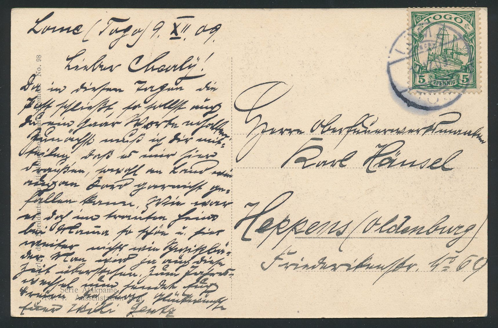 Ansichtskarte Atakpame - Aussenstation ..., Verlag der Norddeutschen Missionsgesellschaft, Bremen, Frankatur 5 Pf., Gitterstempel Lome 12.12.09, nach Heppens, Bedarf