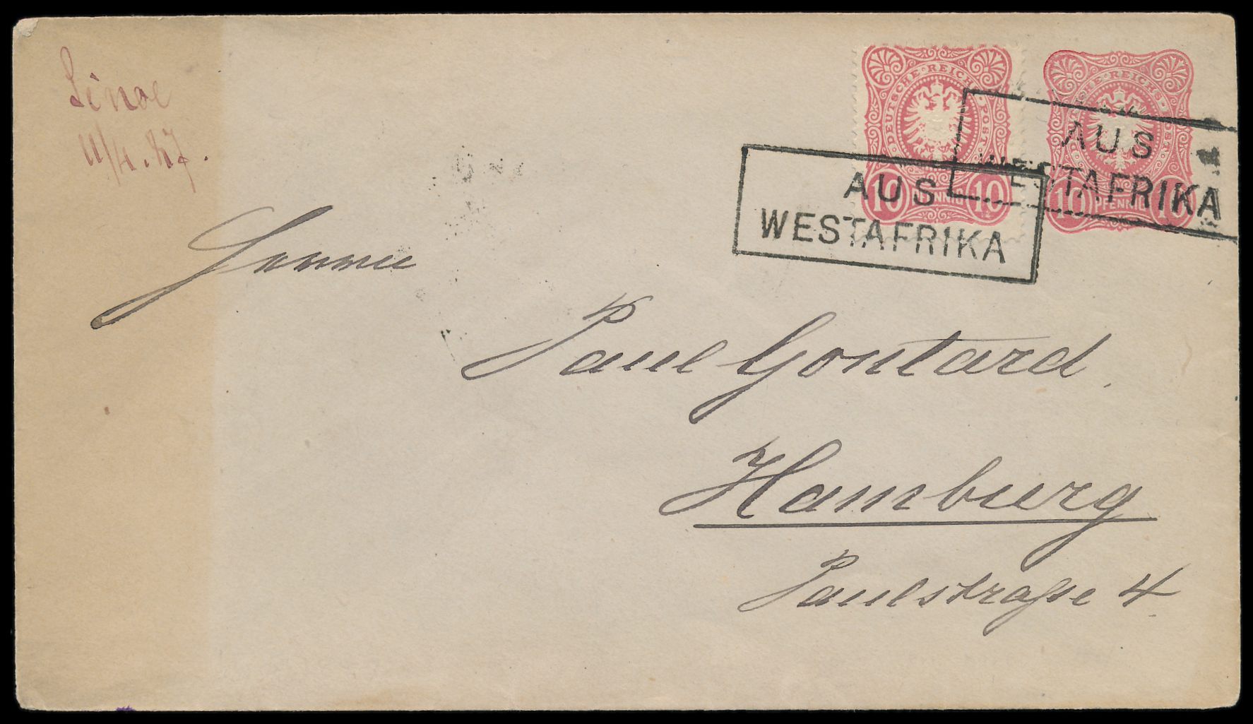 Dt. Reich-Ganzsachenumschlag 10 Pf. mit Zusatzfrankatur 10 Pf. nach Hamburg, links oben handschriftlicher Aufgabevermerk "Sinoe 11.4.87" (in Liberia), in Hamburg entwertet mit 2 x R2 Aus Westafrika, frühes Datum für diesen Stempel, Ankunftstempel 8.5.87, angeblich einzig bekannter Belege mit Aufgabevermerk "Sinoe", links schwache Randbräunung, geprüft Dr. Steuer BPP