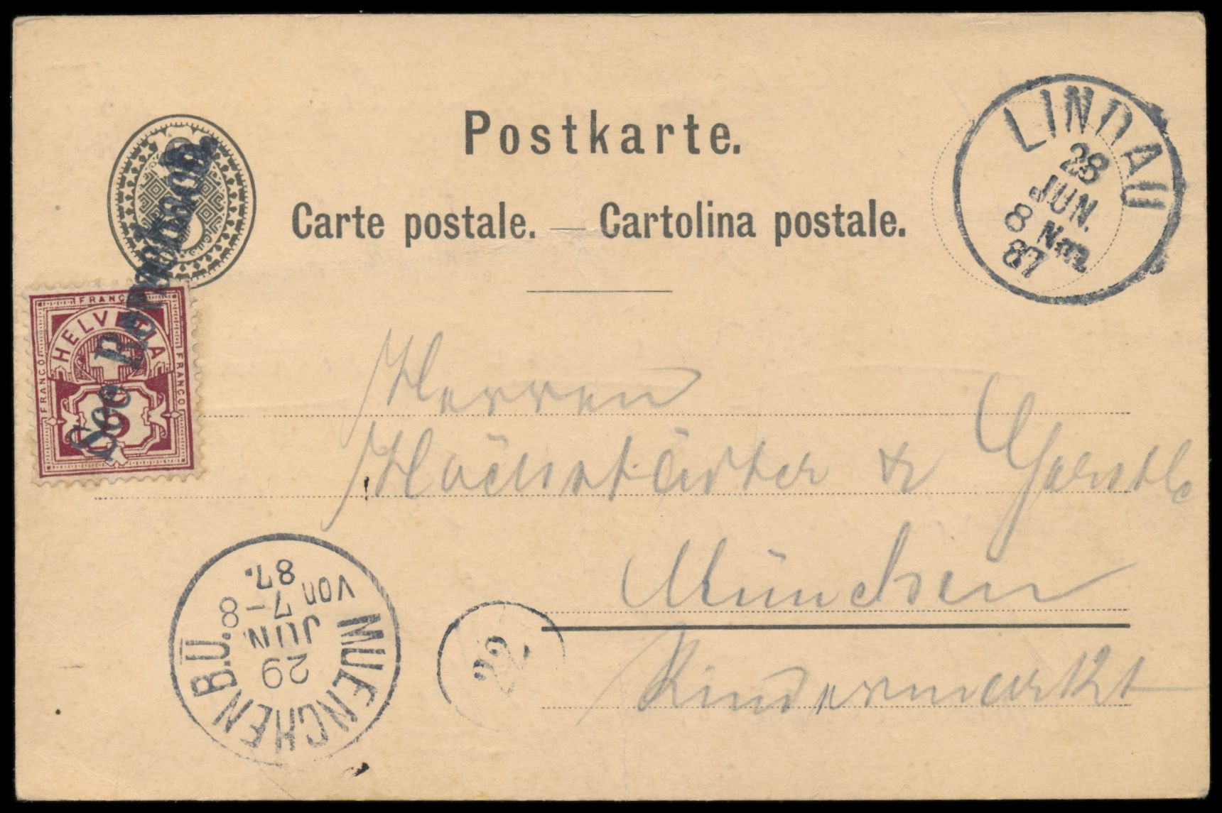 Bodensee-Schiffspost: Schweiz-Ganzsache 5 Rp. mit Zusatzfrankatur 5 Rp. aus Rorschach nach München, Stempel Lindau 28.6.87 und seltener L1 "See Rorschach" als Entwertung, Ankunftstempel 29.6.87, Handbuch LP, Bedarf