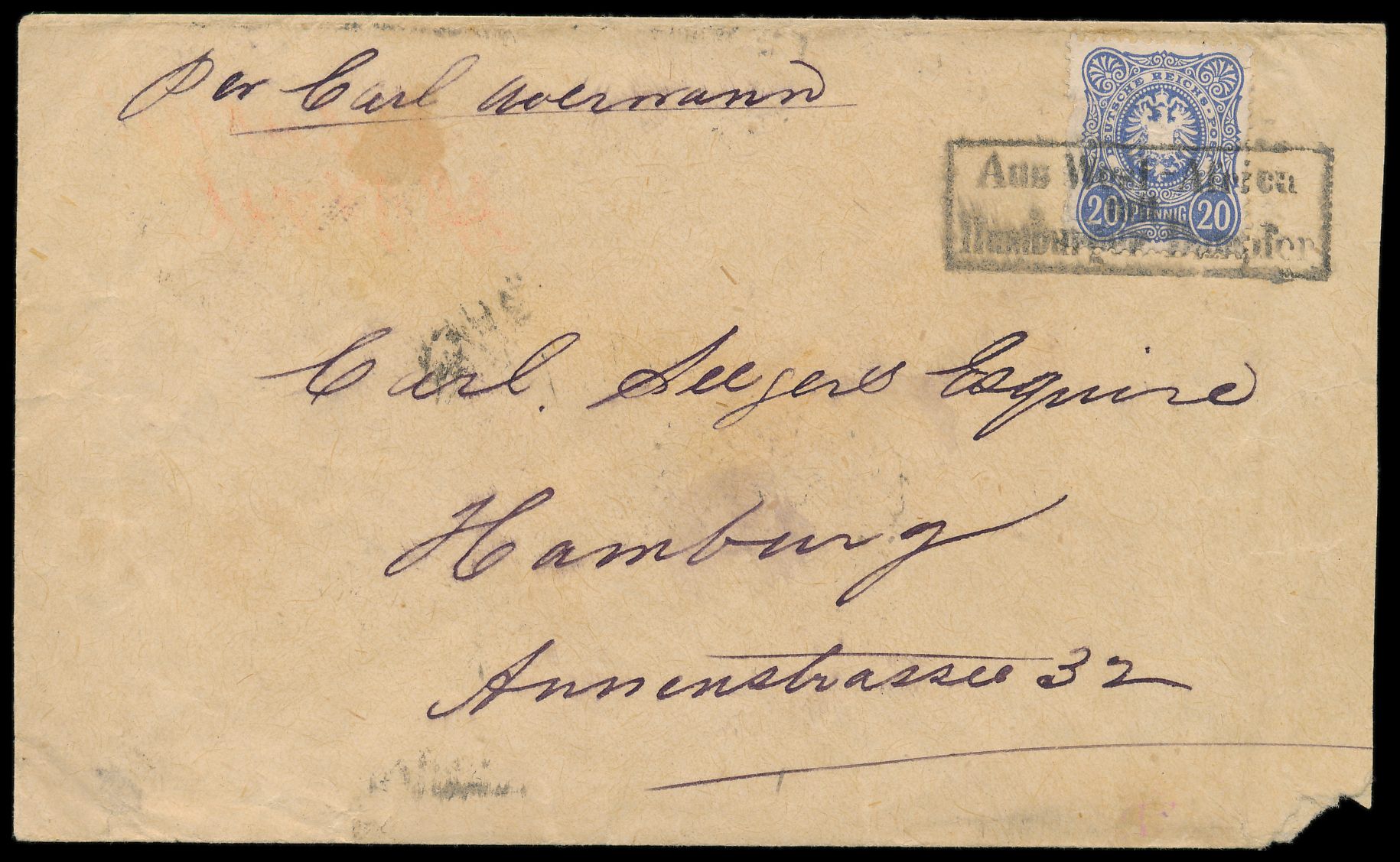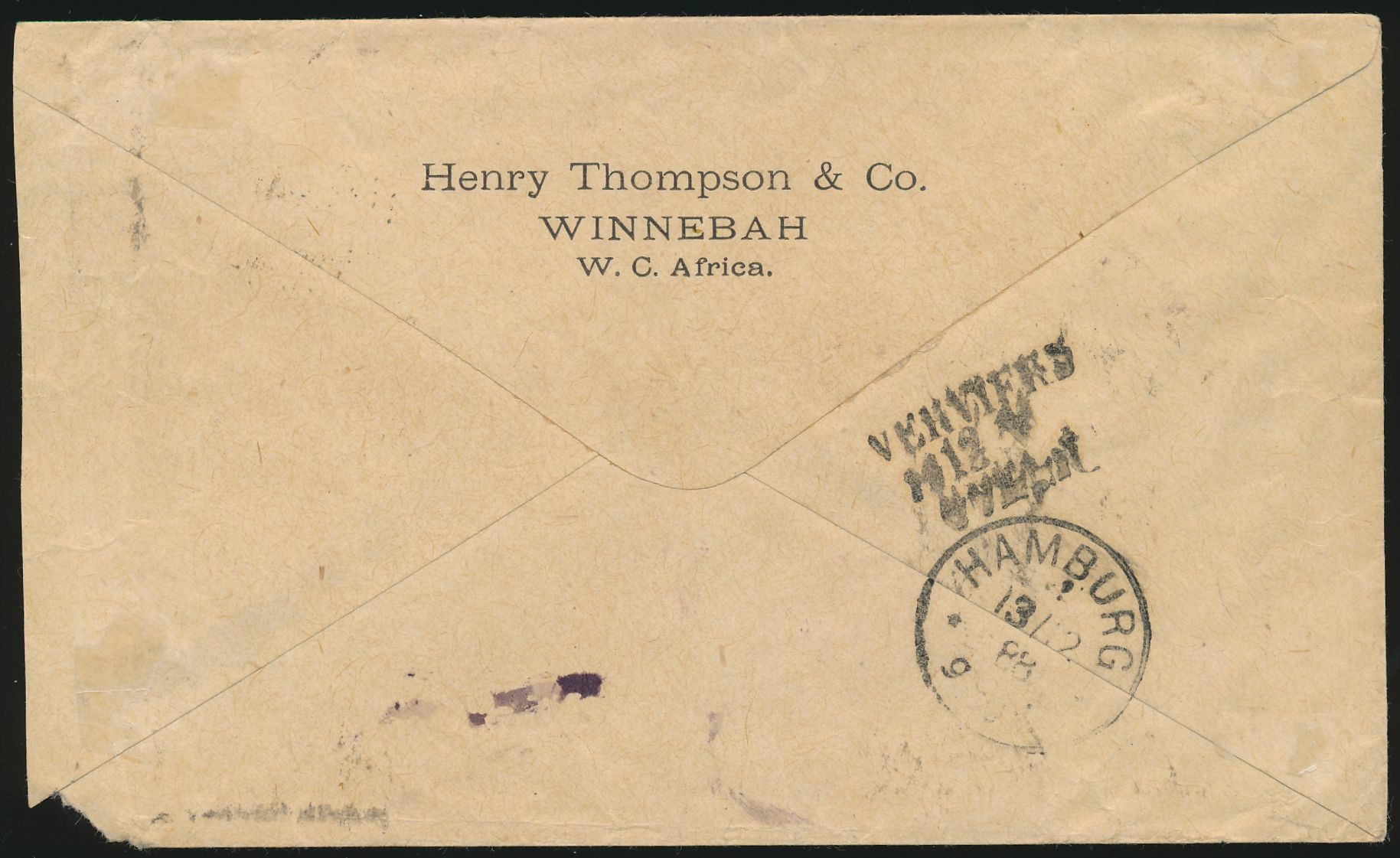 Brief mit rückseitigem Absendereindruck "Henry Thompson & Co. Winnebah W.C. Africa" (Gold Coast) mit Leitvermerk "per Carl Woermann" nach Hamburg, roter handschriftlicher Aufgabevermerk "Quittah", R3 Aus West-Africa / mit / Hamburger Dampfer als Entwertung auf 20 Pf. (beschädigt), rückseitig Bahnpost-L3 Verviers - Cöln und Ankunftstempel Hamburg 13.12.88