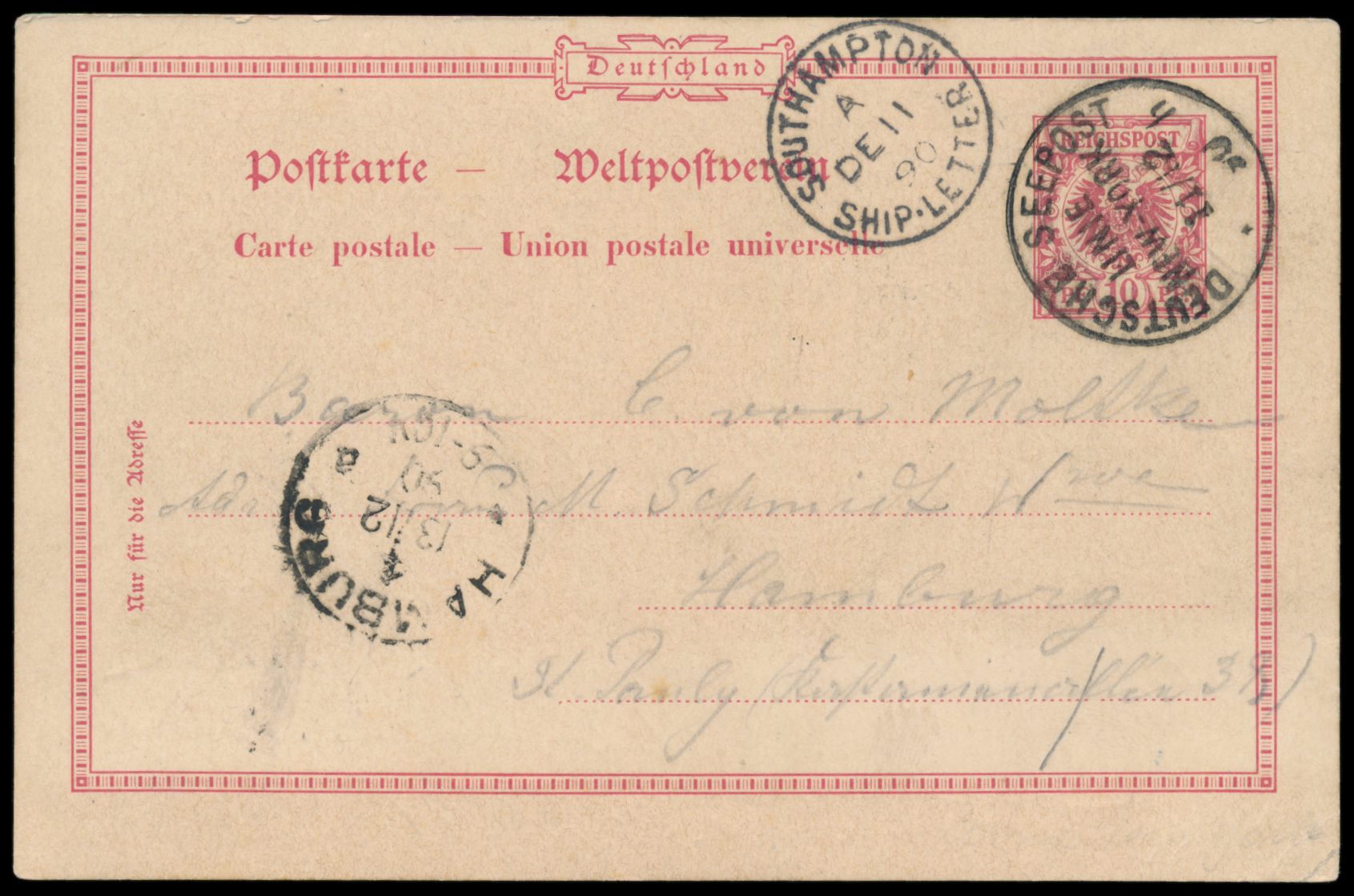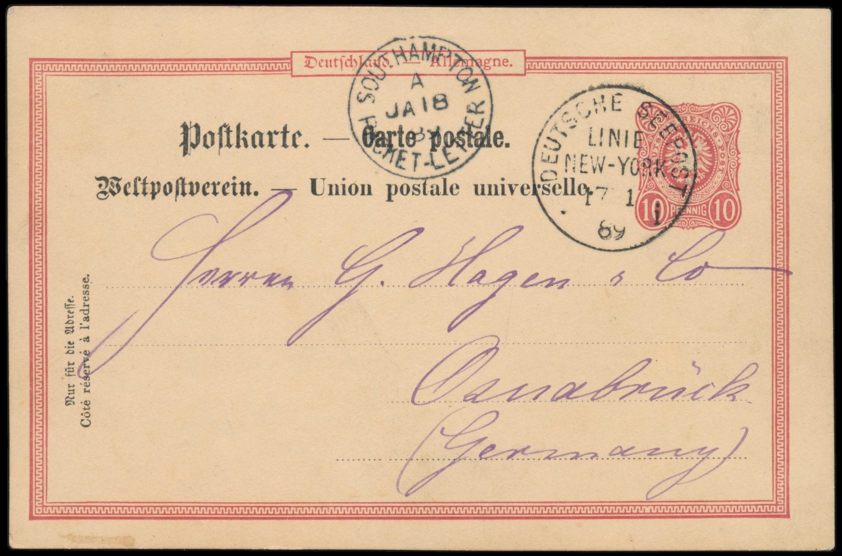 Stempel Deutsche Seepost Linie New York h 11.12.90, Dampfer Lahn, auf Ganzsache 10 Pf. nach Hamburg, Durchgangstempel Southampton Packet-Letter 11.12.90, Ankunftstempel 13.12.90, Bedarf