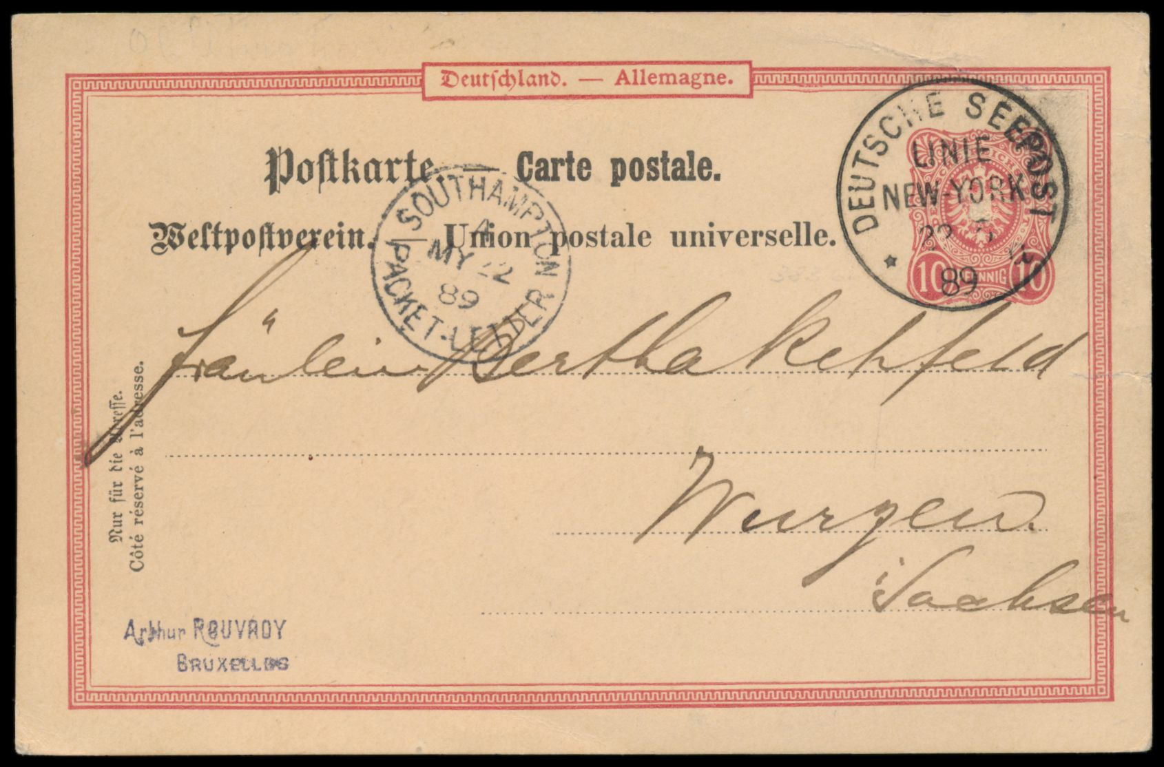 Stempel Deutsche Seepost Linie New York a 22.5.89, Dampfer Eider, sehr frühes Stempeldatum (belegt ab 2.4.1889), auf Ganzsache 10 Pf. nach Wurzen, Durchgangsstempel Southampton Packet-Letter 22.5.89, Bedarf