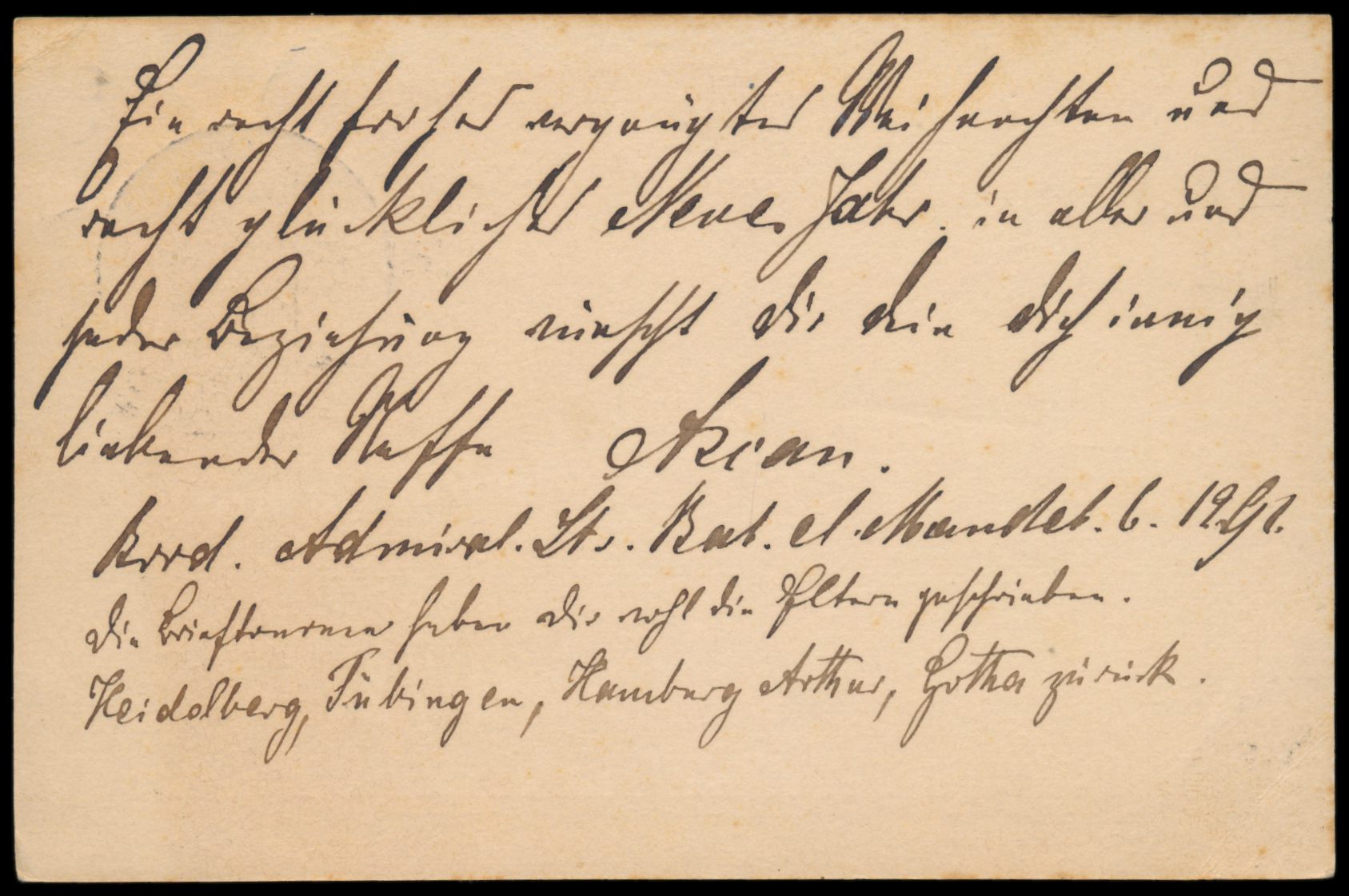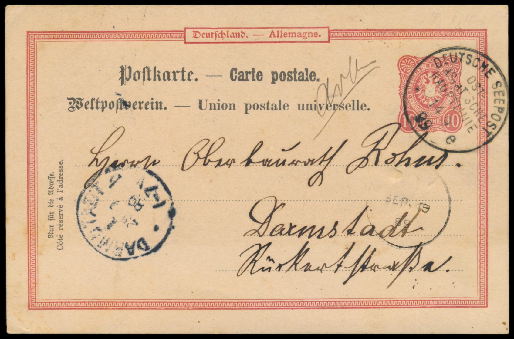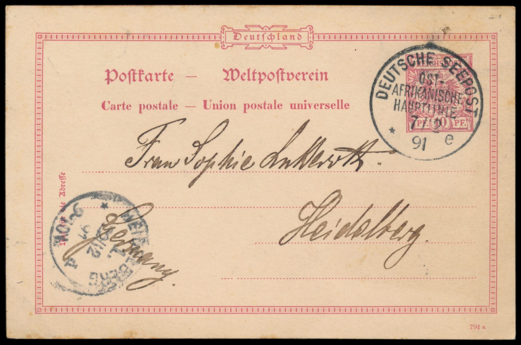 Stempel Deutsche Seepost Ost-Afrikanische Hauptlinie * e 7.12.91, Dampfer Admiral auf der Fahrt nach Deutsch-Ostafrika in Aden, Ganzsache 10 Pf. nach Heidelberg, Ankunftstempel 22.12.91, seltener Beleg von der 1. Fahrt dieses Dampfers auf dieser Linie, Bedarf