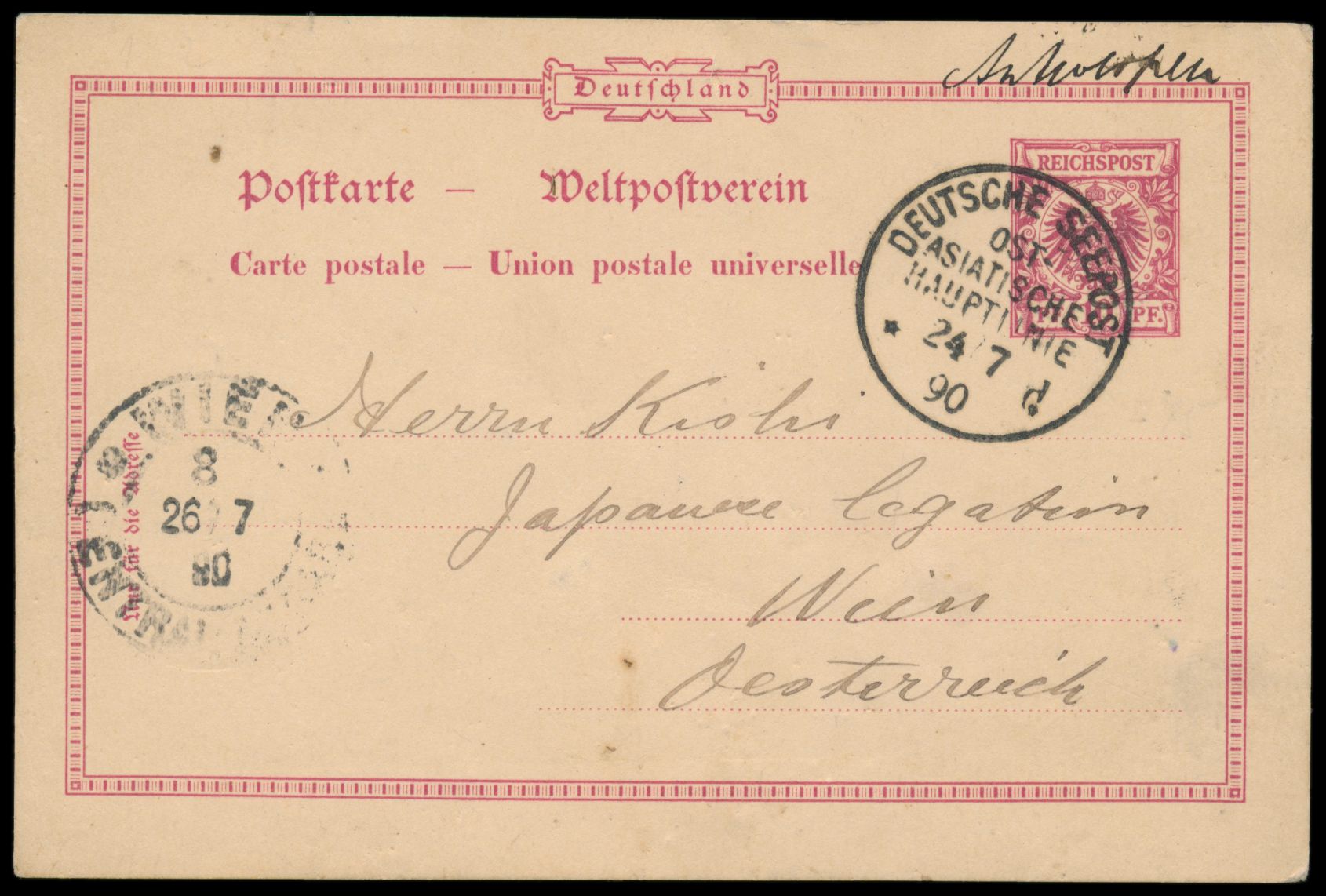 Stempel Deutsche Seepost Ost-Asiatische Linie d 24.7.90, Dampfer Bayern, und handschriftliche Aufgabe "Antwerpen" , auf Ganzsache 10 Pf. an einen Angehörigen der Japanischen Gesandtschaft in Wien, Kartentext auf Japanisch, Ankunftstempel Wien 26.7.90, Bedarf