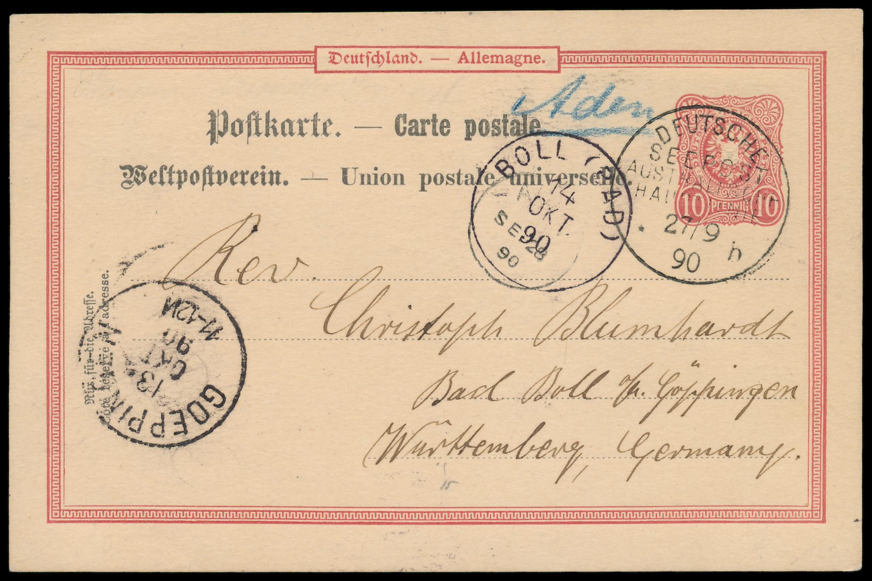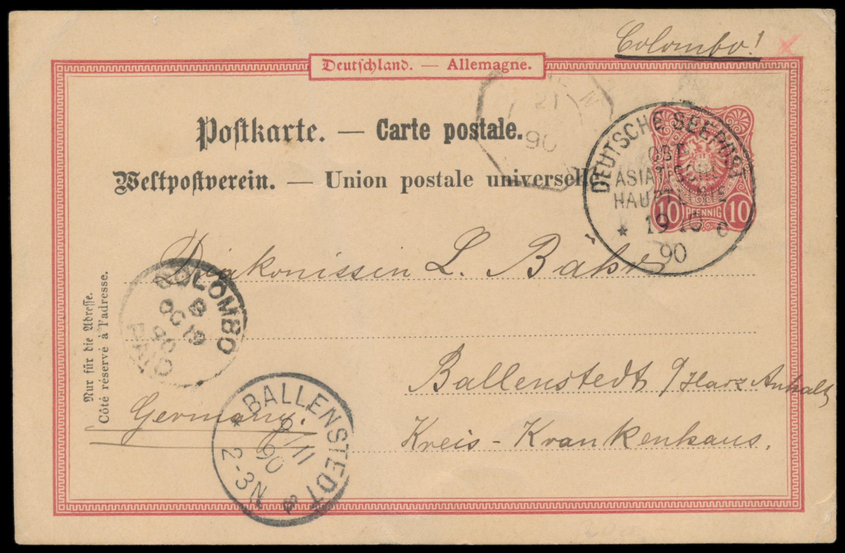 Stempel Deutsche Seepost Ost-Asiatische Hauptlinie c 19.10.90 und handschriftliche Ortsangabe Colombo auf Ganzsache 10 Pf. nach Deutschland, geschrieben "An Bord der Braunschweig", Durchgangstempel Colombo Paid 19.10.90, Ankunftstempel Ballenstedt 9.11.90, langer Bedarfstext