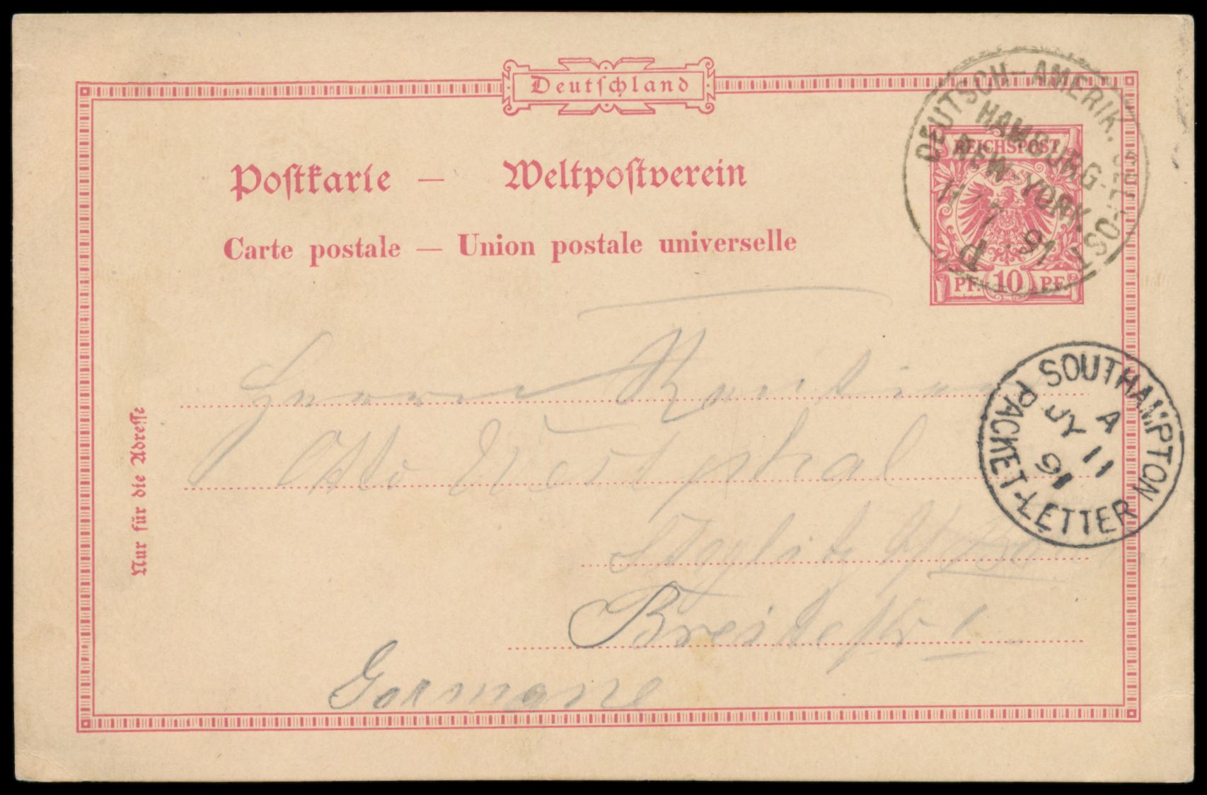 Stempel Deutsch-Amerik. Seepost Hamburg - New York d 11.7.91, Dampfer Auguste Victoria, Stempel war nur 1891 für wenige Fahrten auf diesem Dampfer, Ganzsache nach Steglitz bei Berlin, Durchgangstempel Southampton Packet-Letter 11.7.91, rückseitig Ankunftstempel 13.7.91, Bedarf