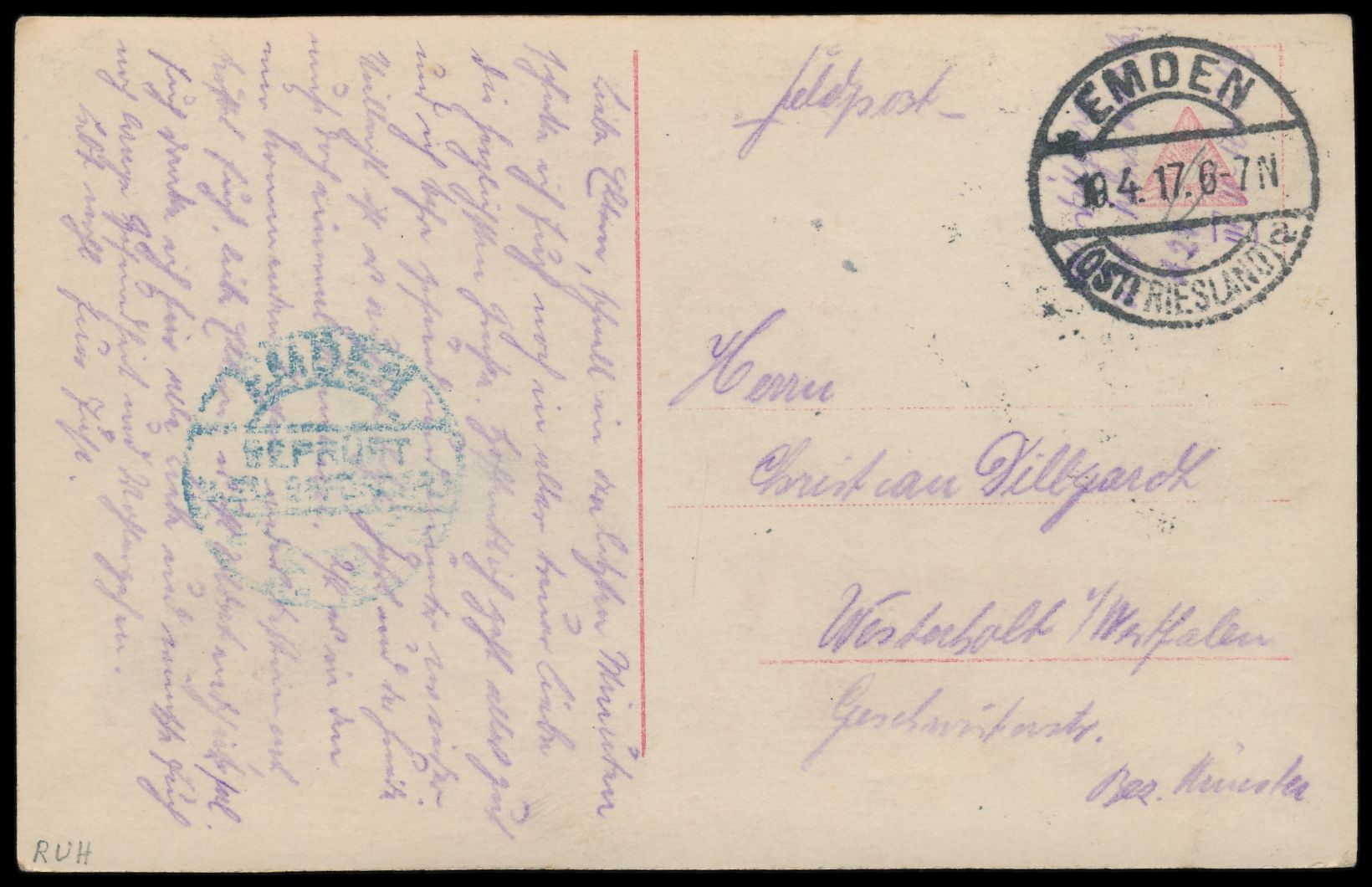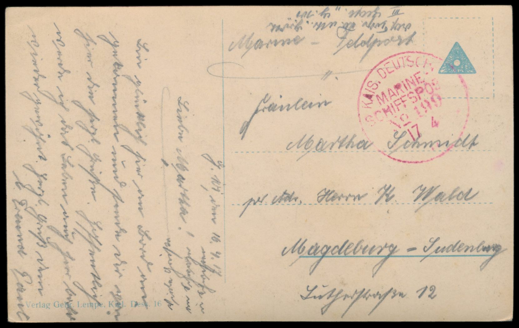 Stempel MSP No. 199 17.4.17, 3. Torpedoboots-Halbflottille, rote Stempelfarbe, Ansichtskarte nach Magdeburg, handschriftlicher Absender ... "G 101", Bedarf
