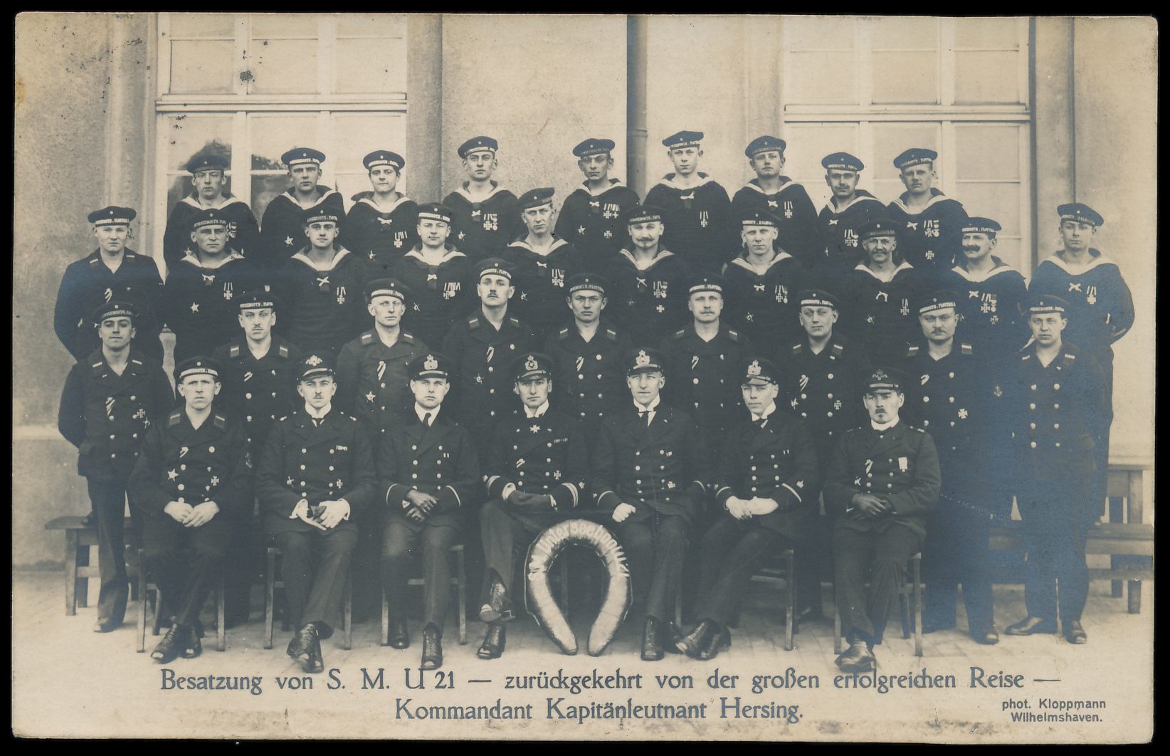 Foto-AK " Besatzung von S. M. U 21 ..." mit Stempel Emden (Ostfriesland) 19.4.17 nach Westerholt, geschrieben von einem Besatzungsmitglied von U 21, unter dem Poststempel handschriftlicher Absender "... U 21, III. U.-Flottille", Zensur Emden