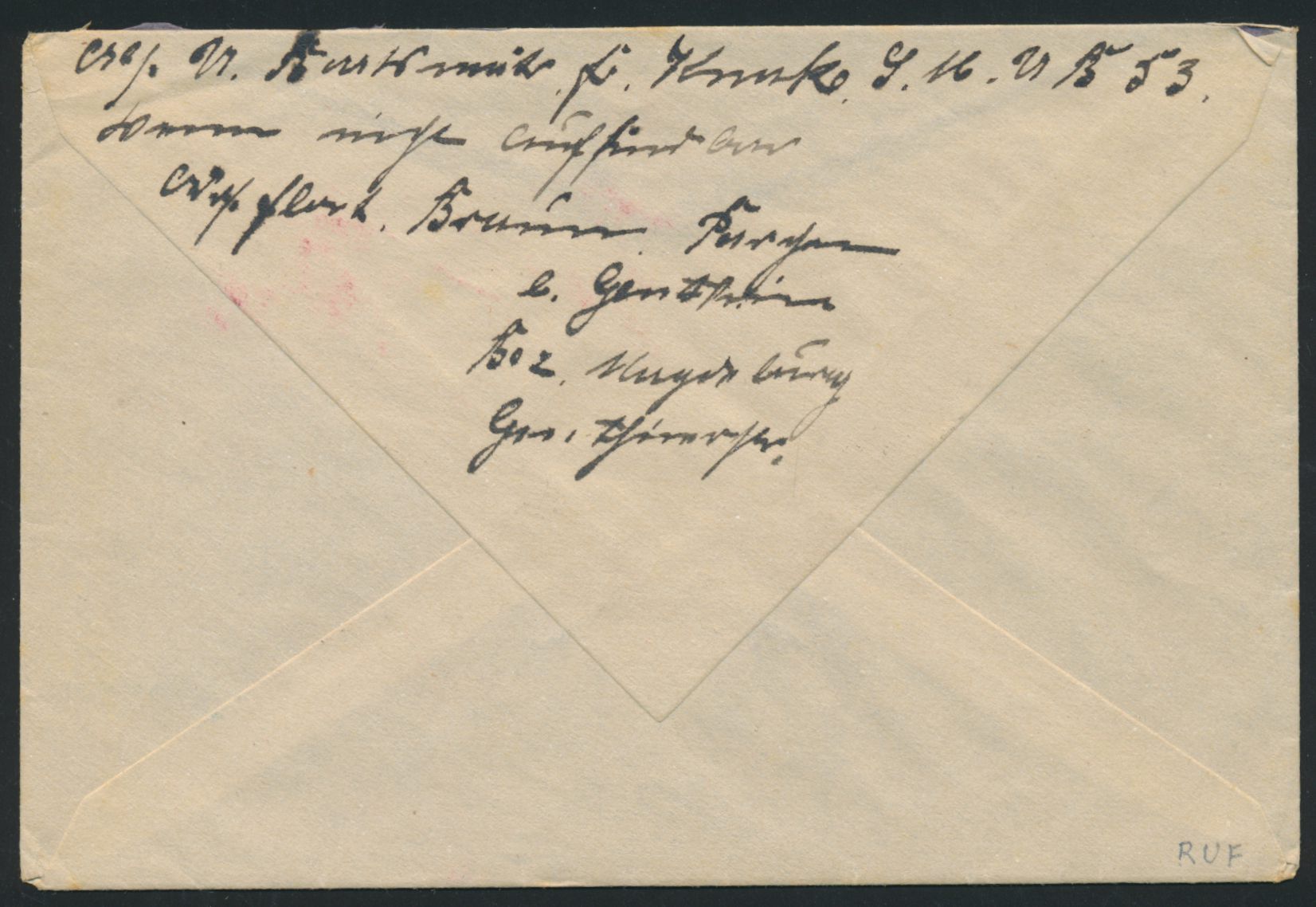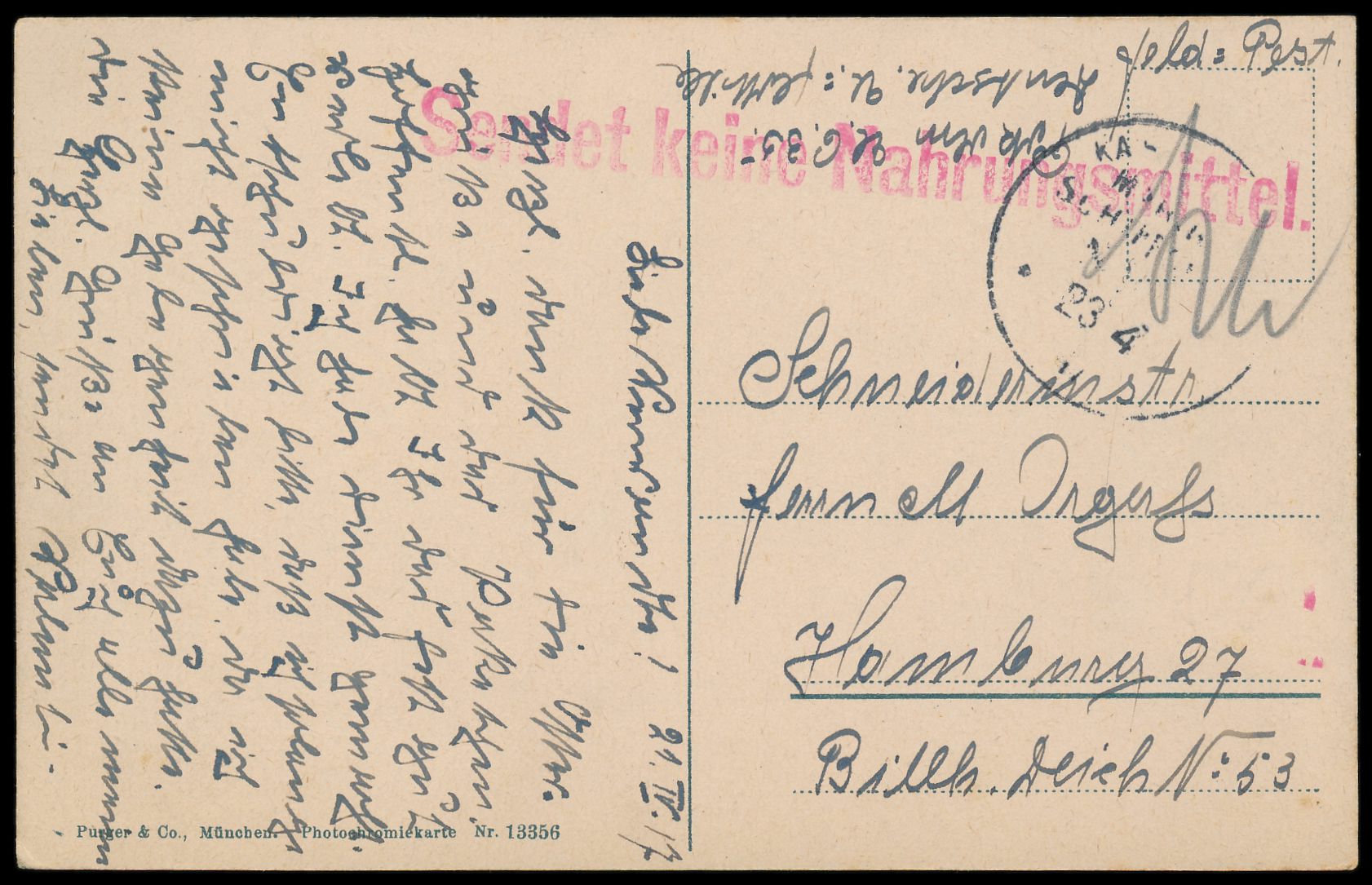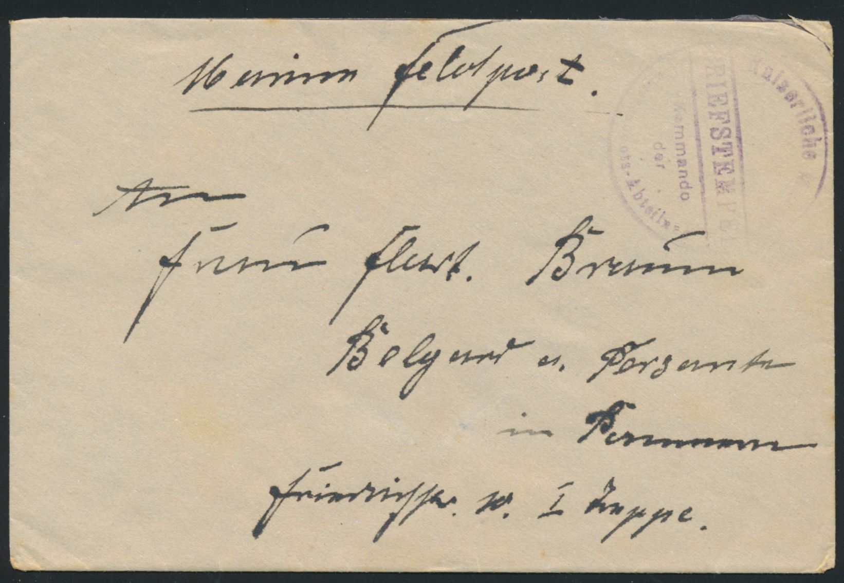 Briefstempel Kaiserliche Marine / Kommando der Unterseeboots-Abteilung als alleiniger Aufgabestempel auf Feldpostbrief nach Belgard, handschriftliche Absenderangabe "U. Bootsmeister ... S. M. UB 53 ...", vermutlich aus Hamburg vor der Indienstnahme durch die Pola-Flottille (August1917)