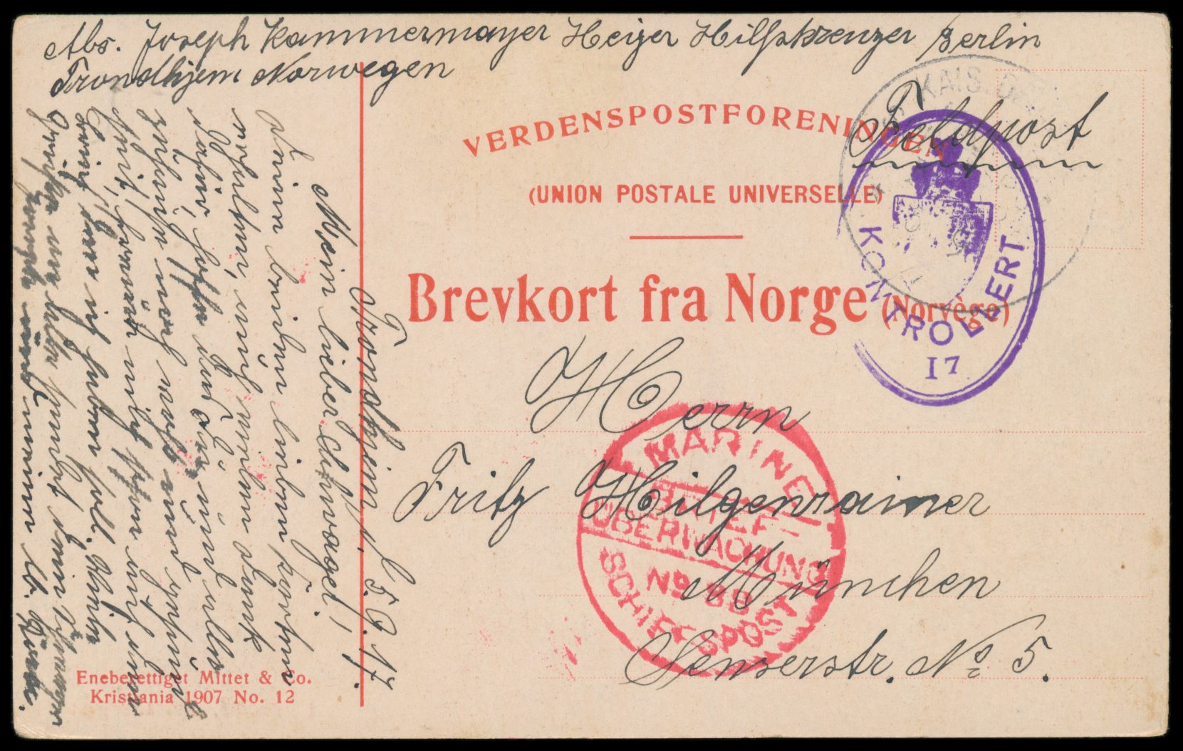 Stempel MSP No. 88 5.9.17, S. M. Hilfskreuzer Berlin, während der Internierung in Trondheim, roter Kreisstempel Marine Schiffspost No. 88 / Brief-Überwachung und norwegischer Zensur-Ovalstempel Kontrolleret 17, Ansichtskarte nach München, Bedarf