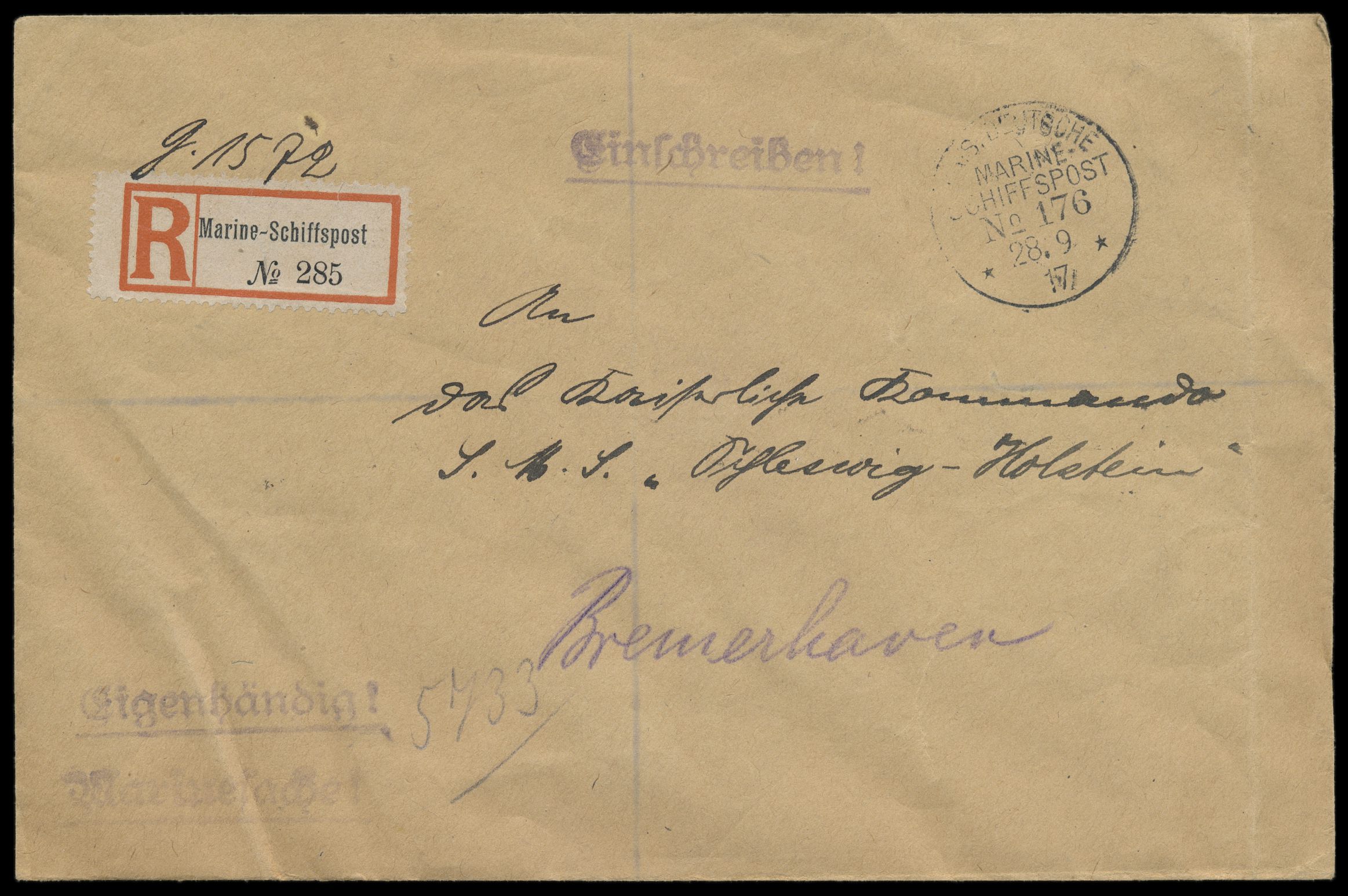 Stempel MSP No. 176 28.9.17, Werkstattschiff Bosnia, auf Dienst-Einschreibbrief "Marinesache" nach Bremerhaven, R-Zettel Marine-Schiffspost mit No. 285, rückseitig Prägedruck-Siegelmarke Führer der Trossschiffe, ASt 29.9.17
