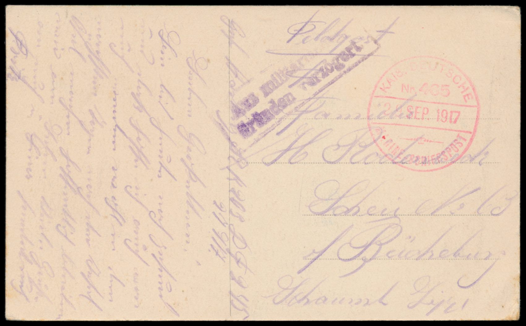 Stempel MSP Nr. 465 29.9.1917 in rot, Hilfskriegsschiff Eskimo, auf Feldpostkarte (Ansicht Libau - Rosenplatz) nach Bückeburg, violetter R2 "Aus militärischen Gründen verzögert", Bedarf