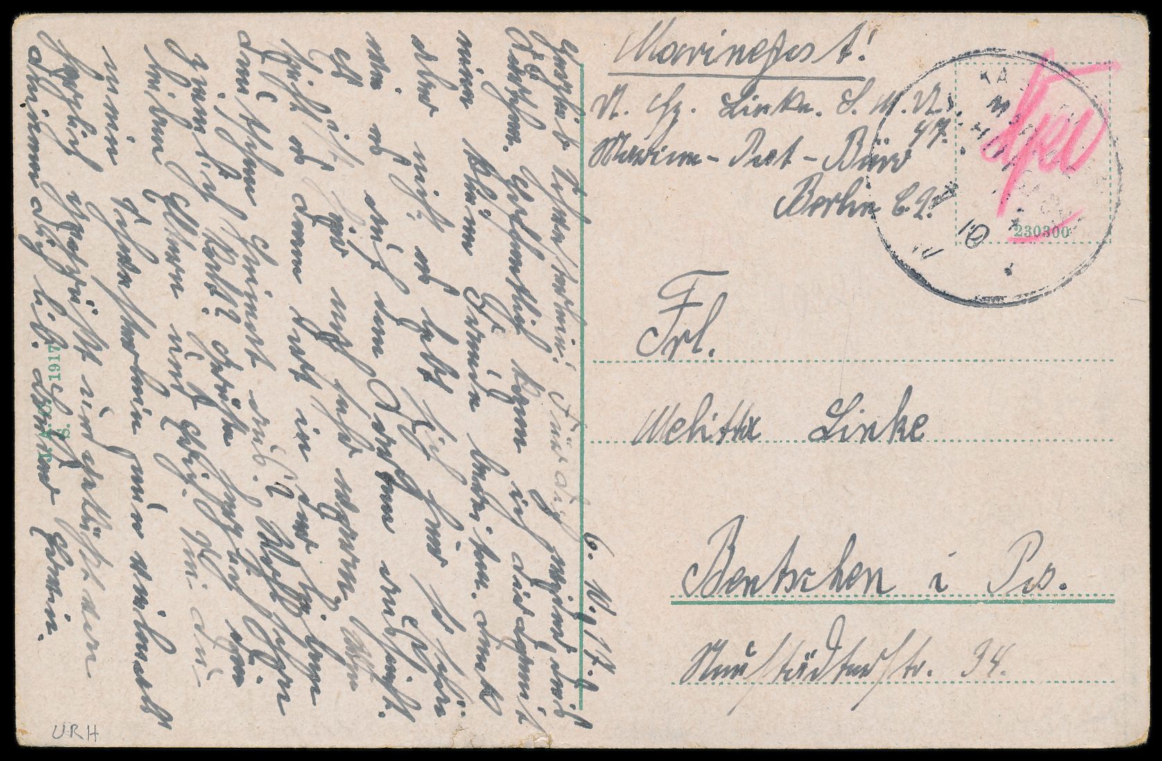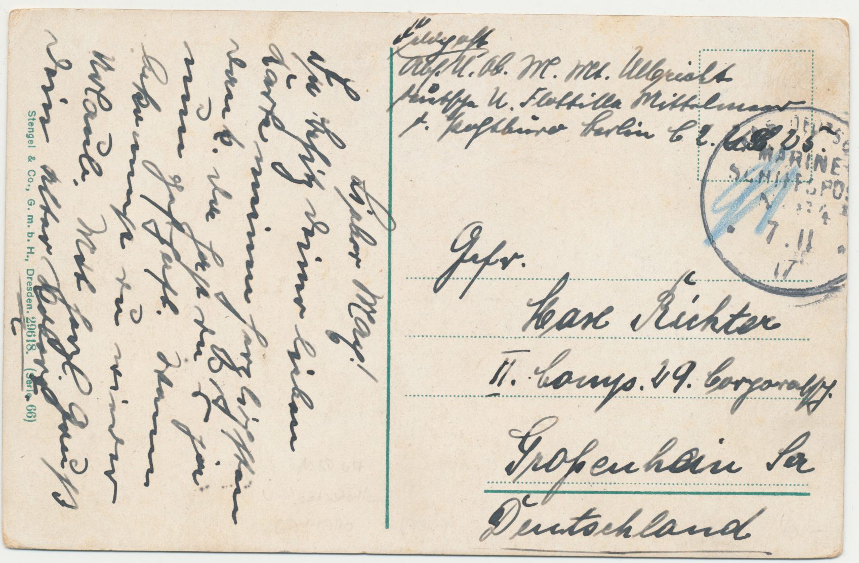 Stempel MSP No. 64 7.11.17, Unterseebootsstation Cattaro, üblicher Abschlag auf Ansichtskarte nach Großenhain, blaue Zensorparaphe, handschriftliche Absenderangabe"... S. M. UC 25 ...", Minenleger, eine von UC 25 gelegte Mine versenkte am 15.5.1917 den französischen Zerstörer Boutefeu