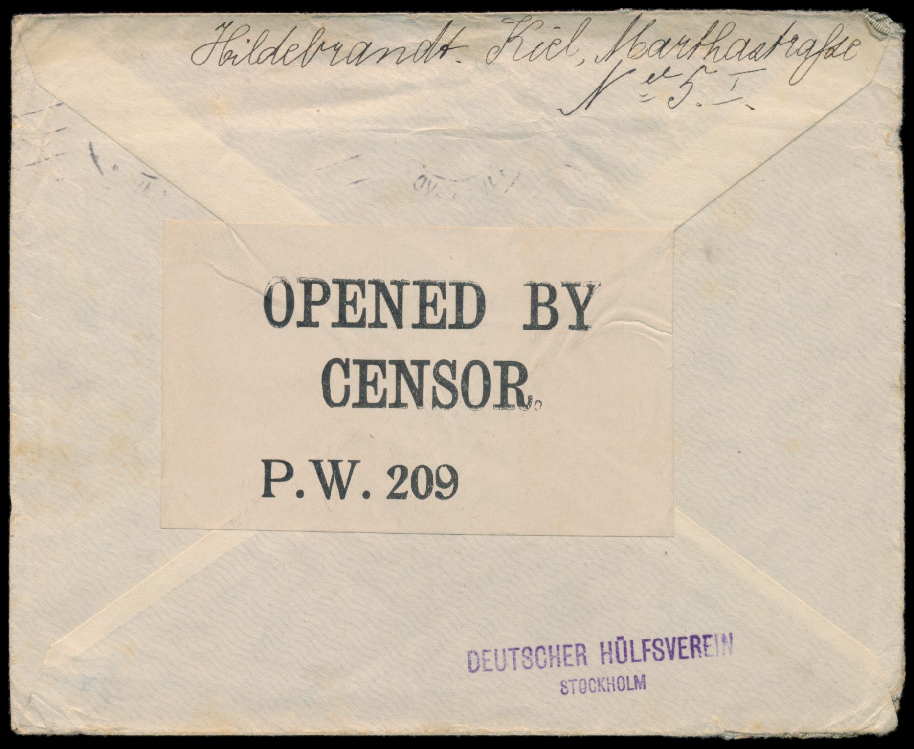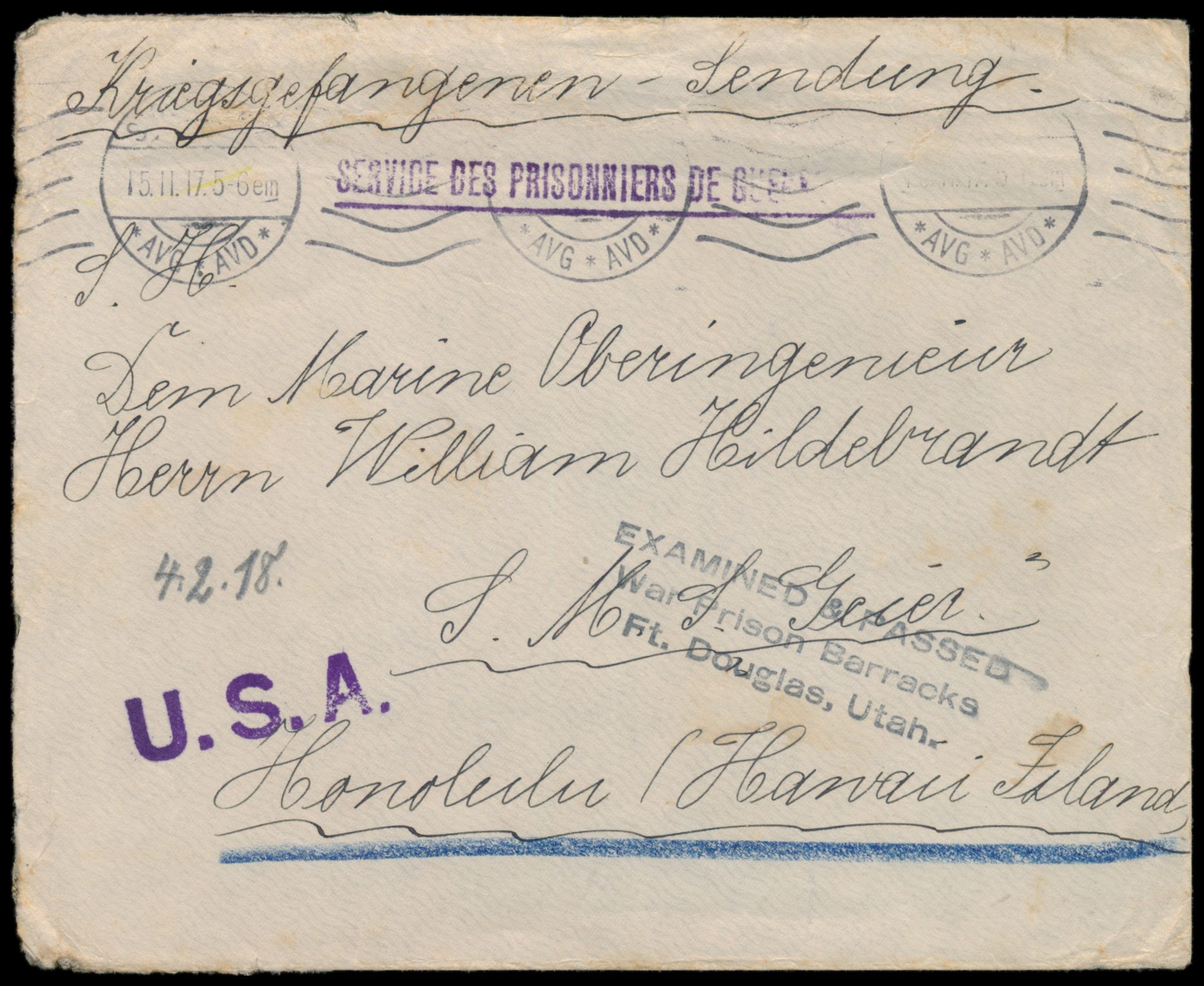 Brief mit Absender aus Kiel an den Marine-Oberingenieur William Hildebrandt von S.M.S. Geier in Honolulu, vermittelt durch den deutschen Hülfsverein in Stockholm, Maschinenstempel Stockholm 15.11.17, rückseitig US-Zensurverschlusszettel, Empfänger zwischenzeitlich in das Kriegsgefangenenlager Fort Douglas verlegt, seltener L3 Examined & Passed / War Prison Barracks / Ft. Douglas, Utah."