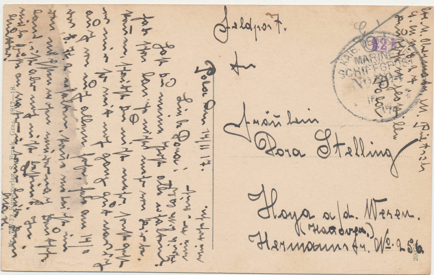 Stempel MSP No. 204 16.11.17, Deutsche Unterseebootsflottille Mittelmeer Pola, auf Ansichtskarte nach Hoya, handschriftliche Absenderangabe"... S. M. UC 27 ...", Minenleger, verantwortlich für die Versenkung von 55 Handelsschiffen und 3 Kriegsschiffen, Bedarf