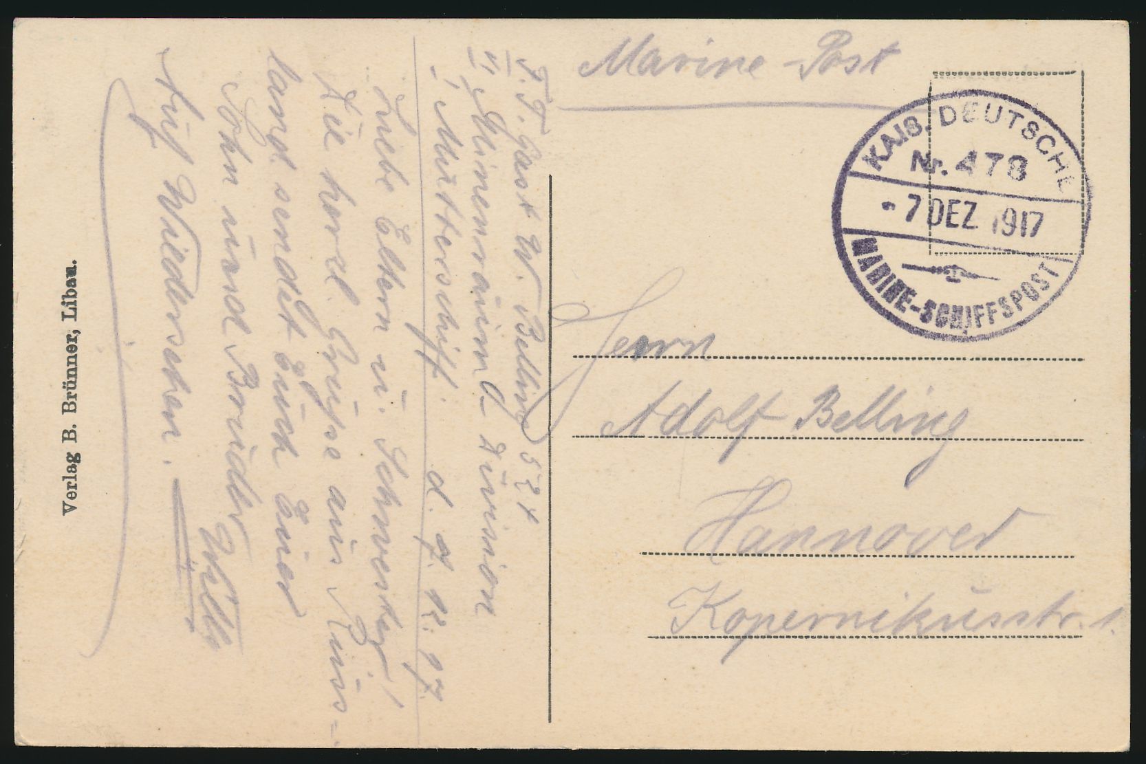 Stempel MSP Nr. 478 7.12.1917, VI. Minenräum-Division, Ansichtskarte Libau mit Absenderangabe "... I. Mutterschiff ...", Feldpost nach Hannover, Bedarf
