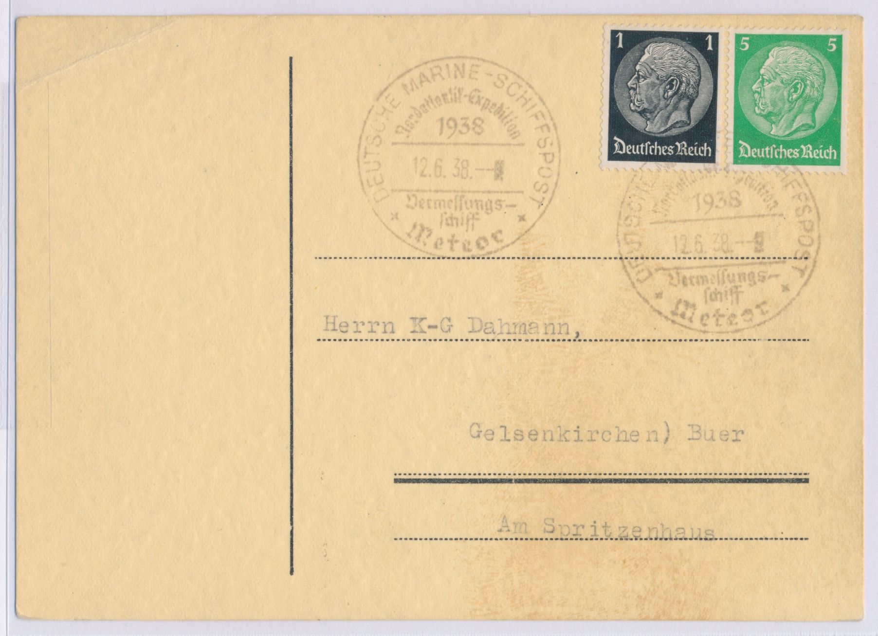 Stempel Deutsche Marine-Schiffspost Nordatlantik-Expedition 1938 Vermessungsschiff Meteor 12.6.38, zwei Abschläge auf Postkarte nach Gelsenkirchen, ohne Text