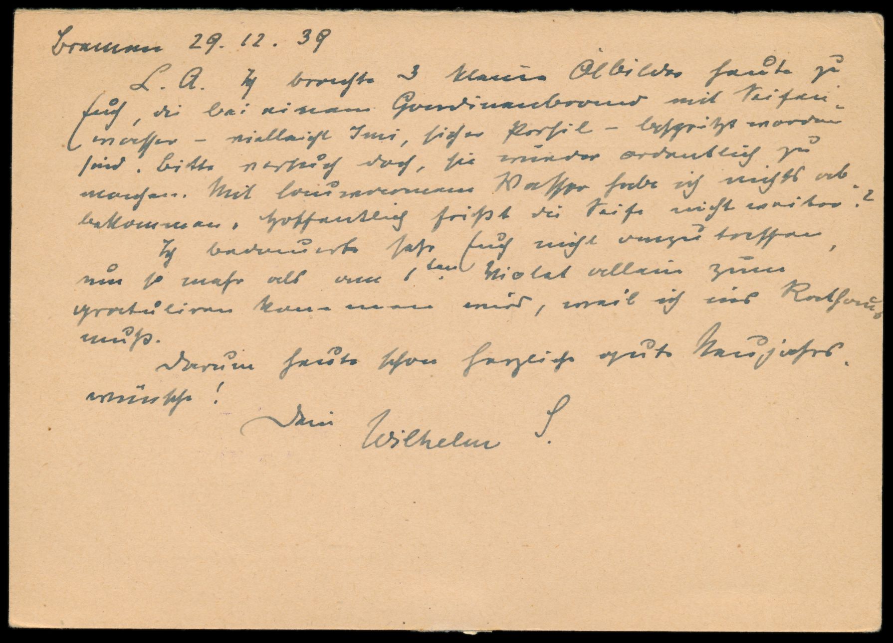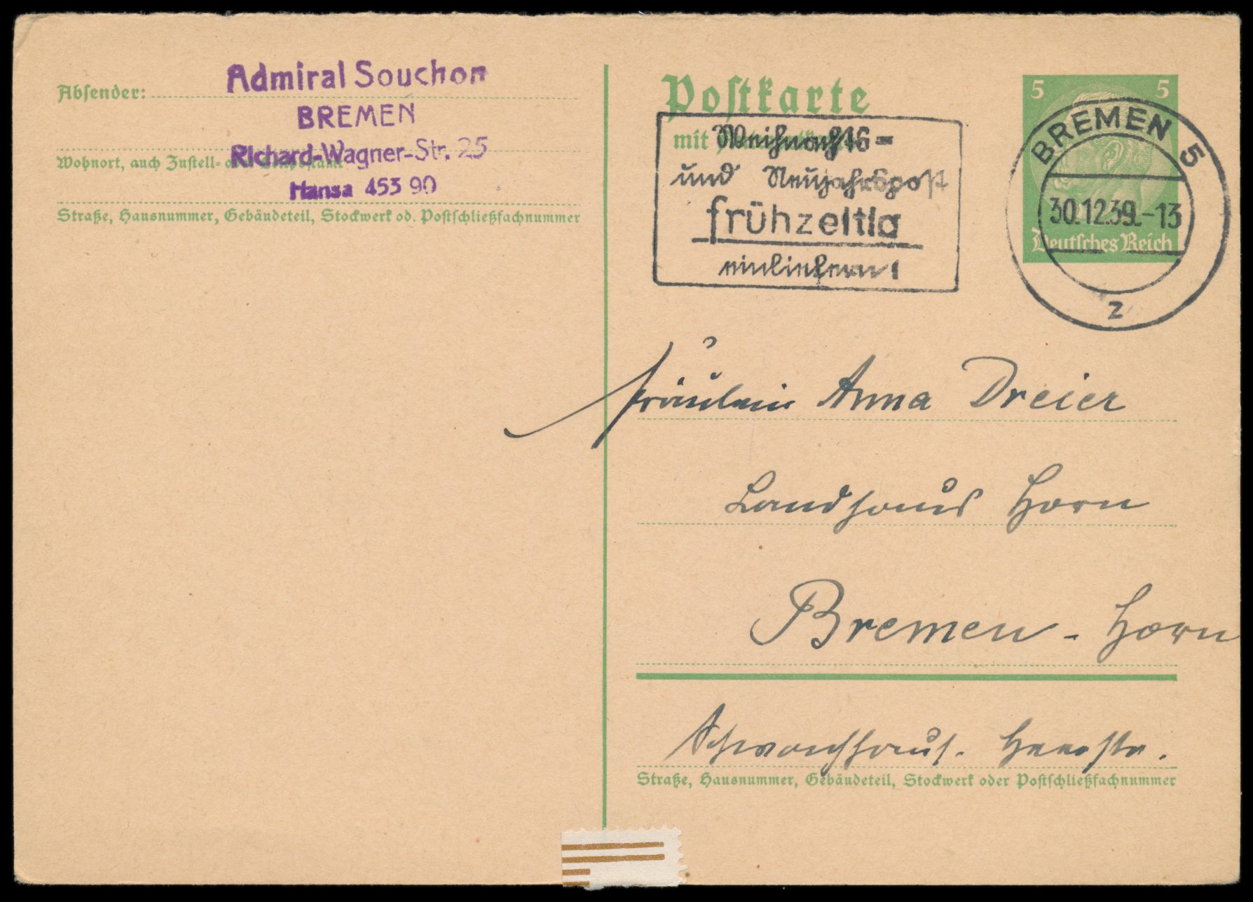 Ganzsachen-Frageteil 5 Pf. mit Absenderstempel "Admiral Souchon ..." und eigenhändig geschriebenem Kartentext mit Unterschrift "Wilhelm S.", Maschinenstempel Bremen 5 30.12.39. Wilhelm Souchon war 1913 Befehlshaber der Mittemeerdivision, während des Krieges Oberbefehlshaber der Osmanischen Marine und 1917 Geschwaderchef in der Hochseeflotte, im November 1918 kurzzeitig Gouverneur von Kiel, 1919 pensioniert, gestorben 1946 in Bremen