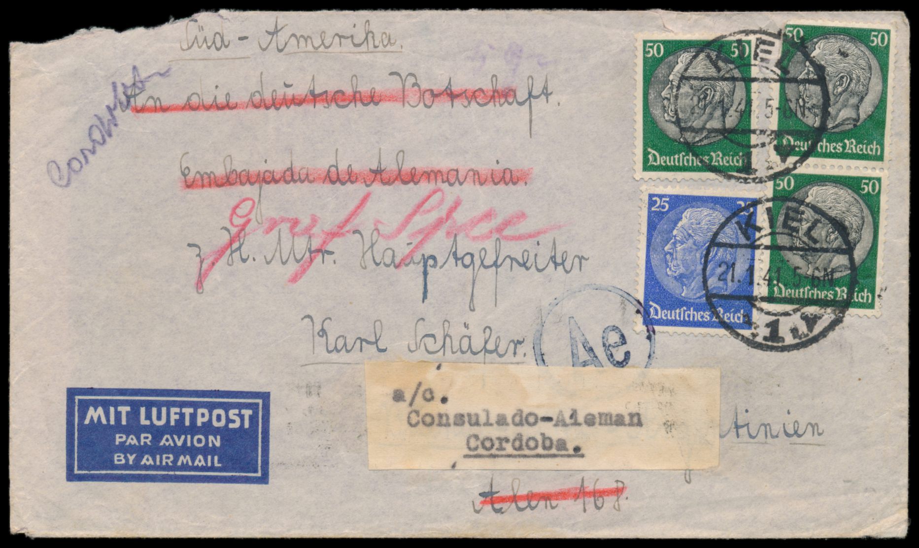 Luftpostbrief an ein interniertes Besatzungsmitglied des Panzerschiff Graf Spee in Argentinien, Frankatur 175 Pf., Stempel Kiel 21.1.41, Durchlaufstempel Ae der Prüfstelle Frankfurt, befördert von Rom mit L.A.T.I. nach Südamerika, in Buenos Aires durch die deutsche Botschaft in Buenos Aires an das deutsche Konsult in Cordoba umadressiert, Umschlag hat links oben kleinen Eckfehler