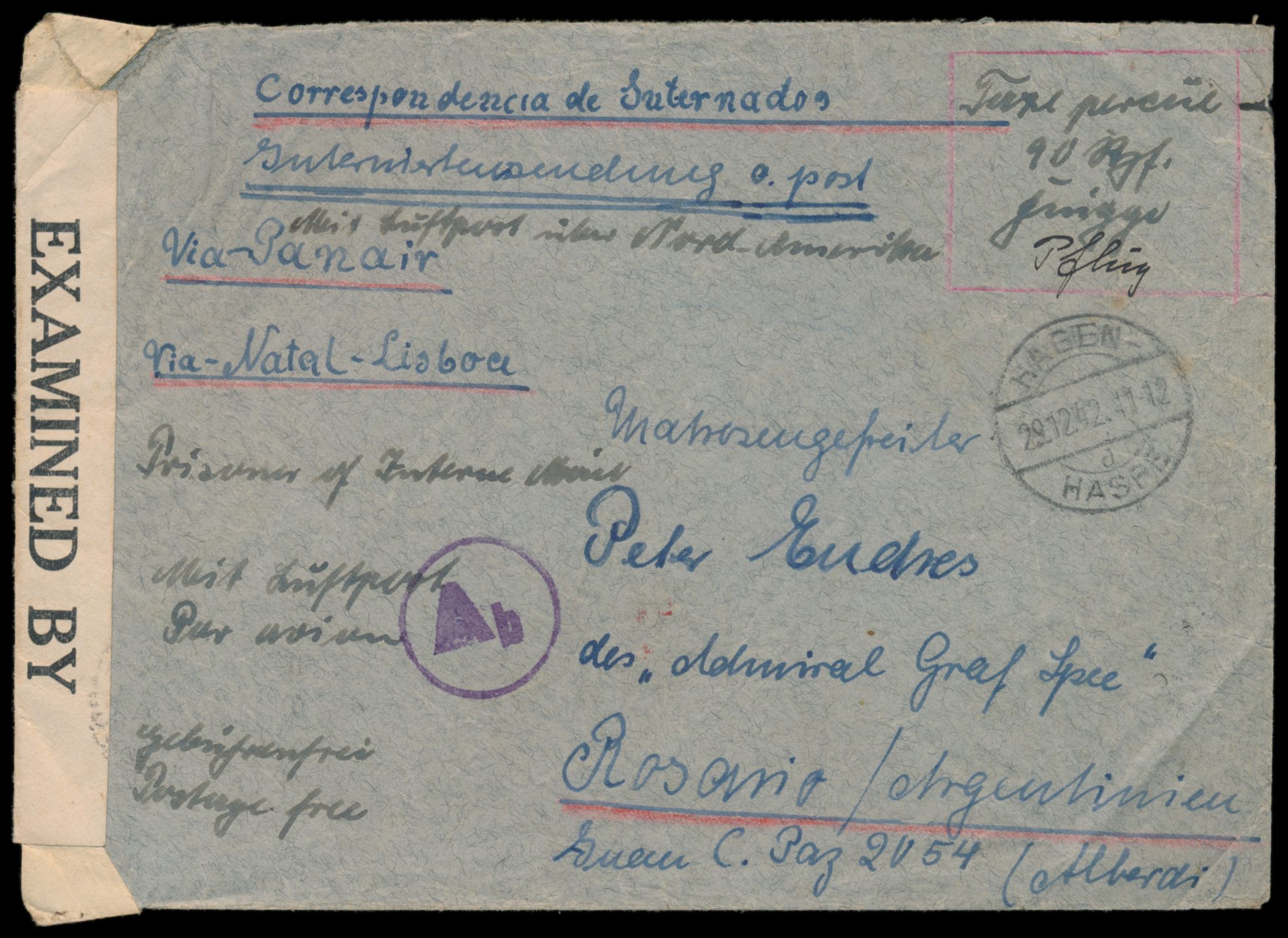 Internierten-Luftpostbrief an ein Besatzungsmitglied des vor der La Plata-Mündung gesunkenen Panzerschiffes "Admiral Graf Spee" in Rosario / Argentinien, mit Panair über Lissabon und Natal nach Argentinien, Luftpostzuschlag bar bezahlt, handschriftlich "Taxe percue 90 Rpf.", Stempel Hagen-Haspe 29.12.42, Zensur-Durchlaufstempel Ab von Berlin, und links Zensurverschlusszettel "Examined by U.S.A. 381", Ankunftstempel Rosario 14.3.43. In Rosario waren nur ein kleiner Teil der 1200 Mann Besatzung interniert
