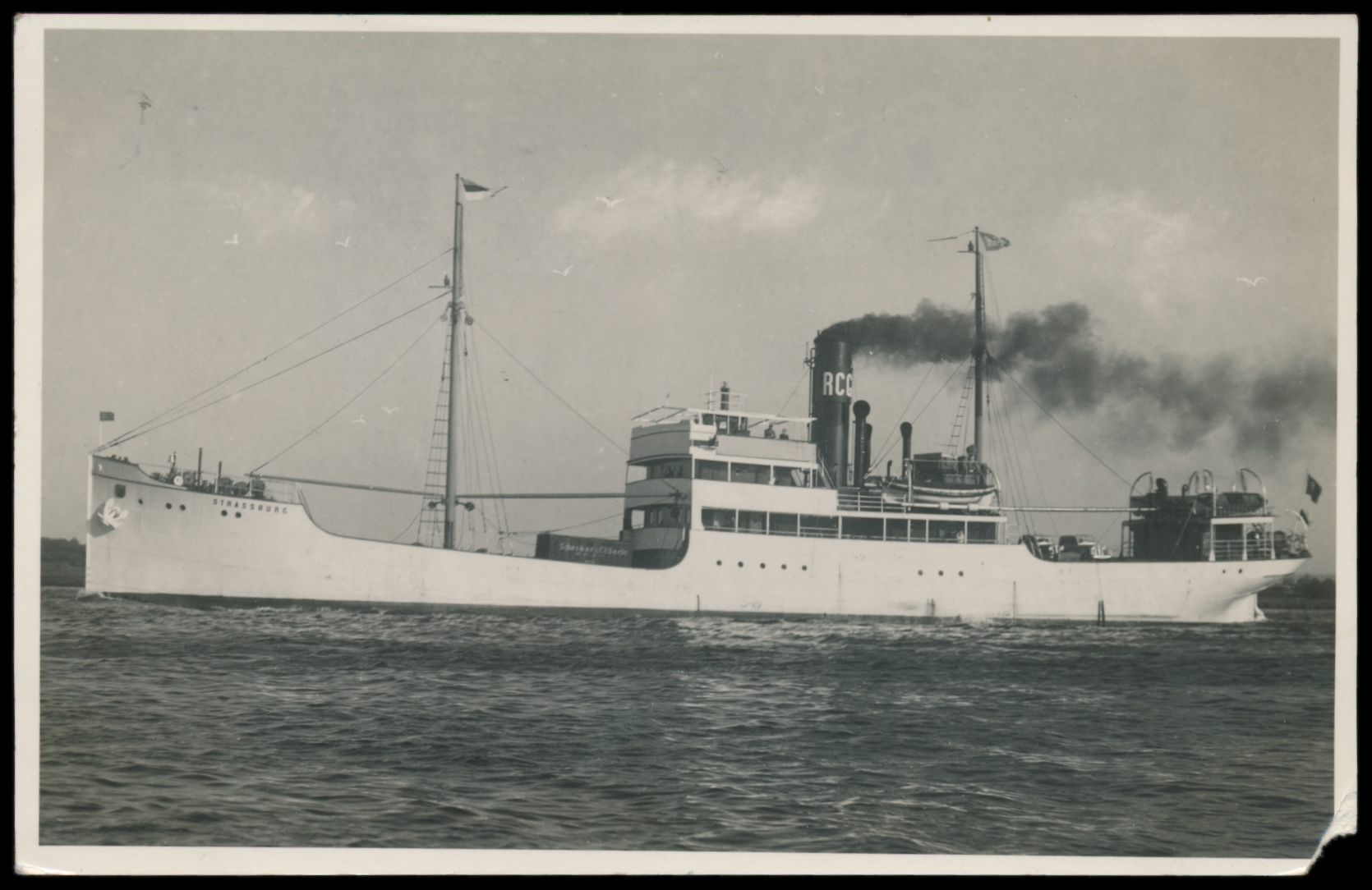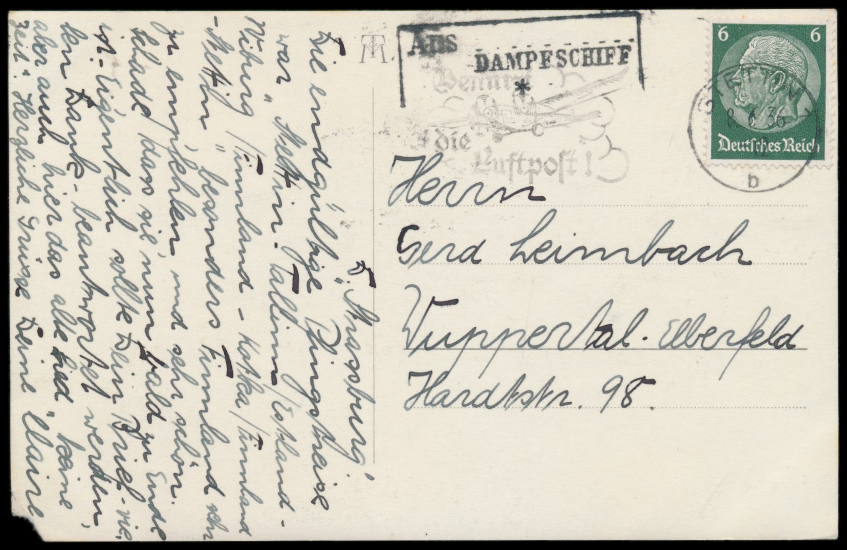 Foto-Ansichtskarte "Dampfer Strassburg" mit 6 Pf. Hindenburg nach Wuppertal, Maschinenstempel Stettin 1 8.6.36 und alter R3 "Aus ... Dampfschiff ..." (alter Preußen-R2), geschrieben an Bord des Schiffes, Karte hat links unten kleinen Eckfehler, Bedarf