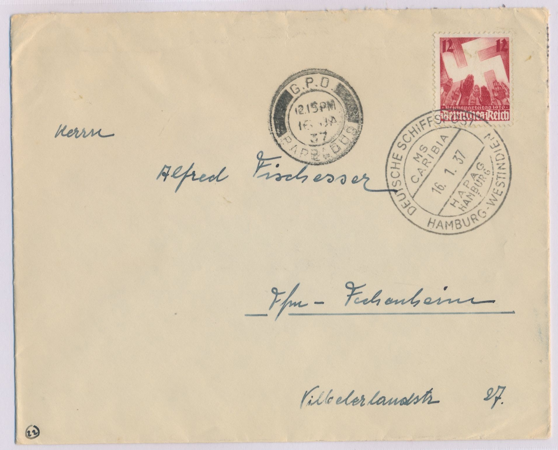 Stempel Deutsche Schiffspost Hamburg - Westindien / MS Caribia HAPAG Hamburg 16.1.37 auf Brief mit Sondermarke 12 Pf. nach Frankfurt, Durchgangstempel G.P.O. Barbados 16.1.37