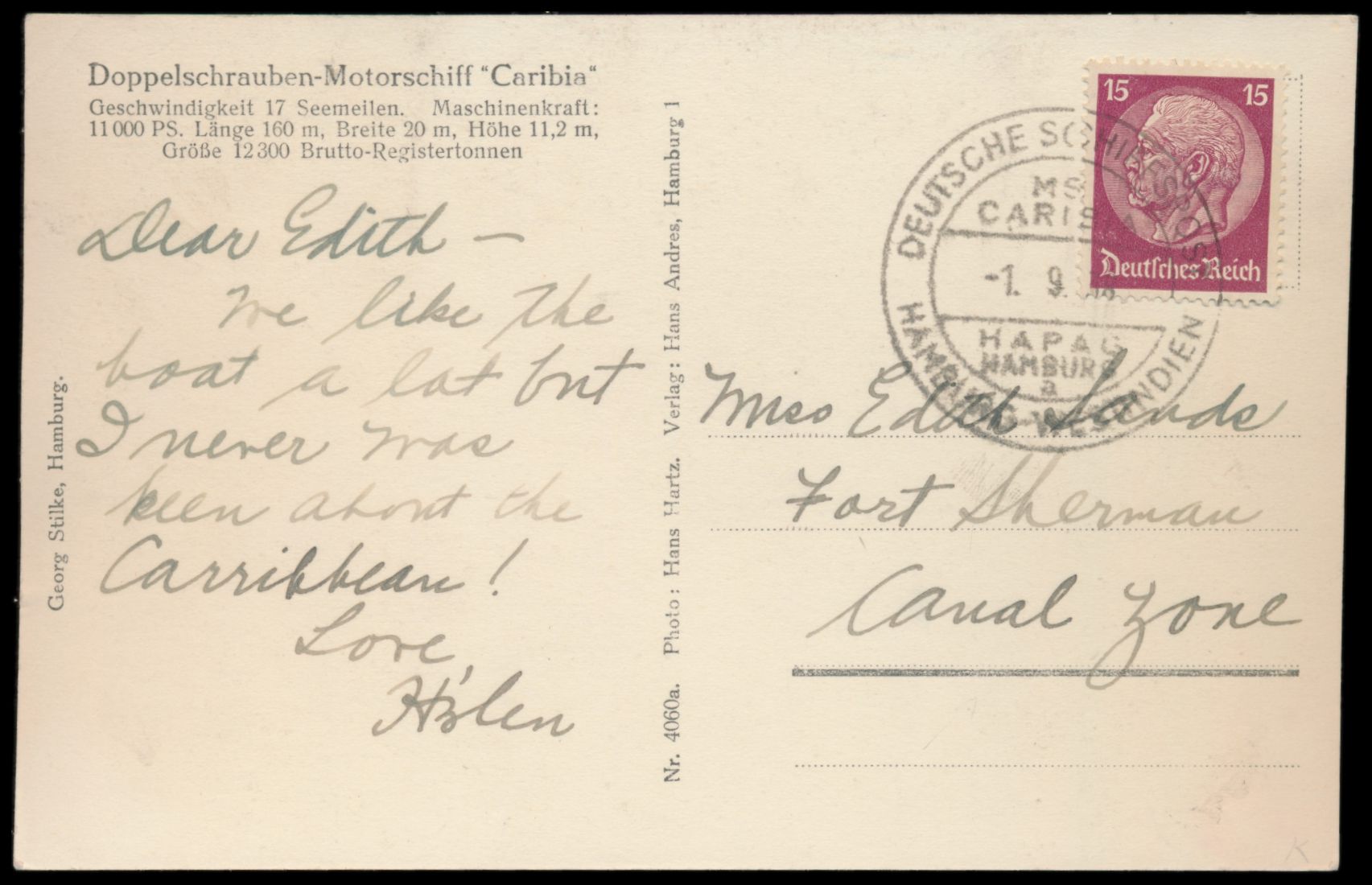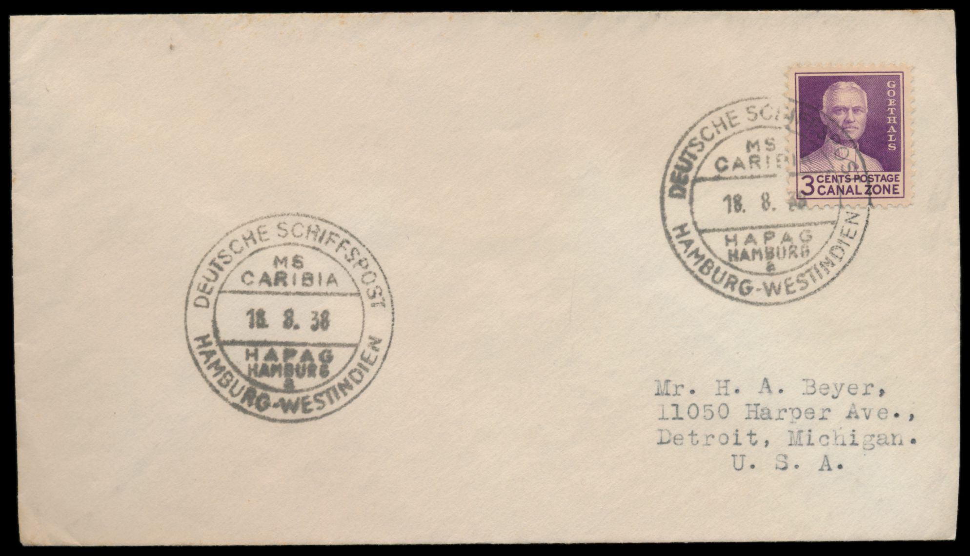 Linie Hamburg Westindien: 3 Belege mit Stempeln der Horn-Linie Hamburg: M S H.G. Horn 7.7.37 (Venezuela-Frankatur), M S Ingrid Horn 13.12.36 (Großbritannien-Frankatur) M S Waltraut Horn 25.3.37 und 2 Belege mit Stempel der H A P A G: M S Caribia 18.8.38 (Frankatur Canal Zone) und 1.9.38, insgesamt 5 Belege mit sauberen Abschlägen, gute Erhaltung, meist Sammler-Belege (1 x Bedarf)